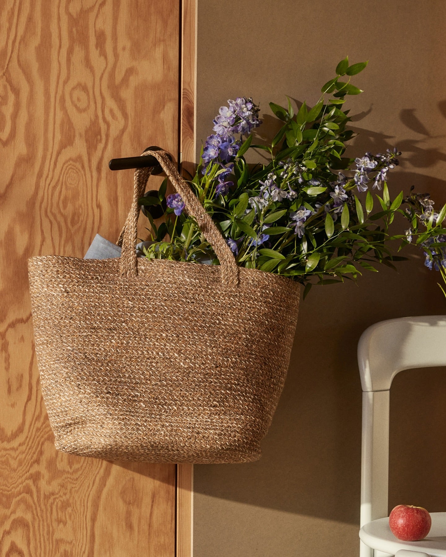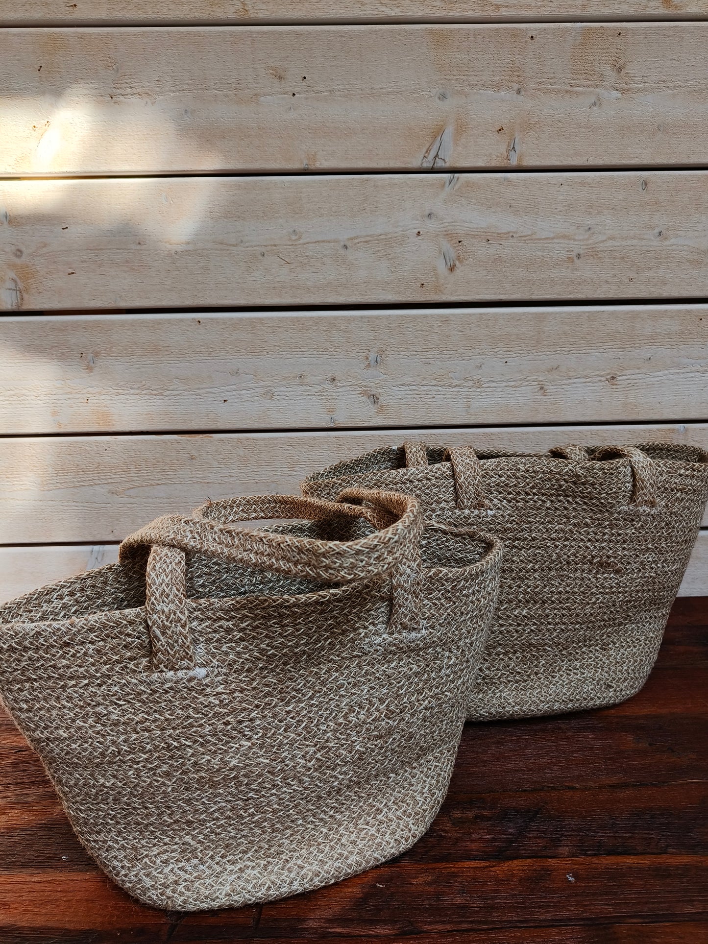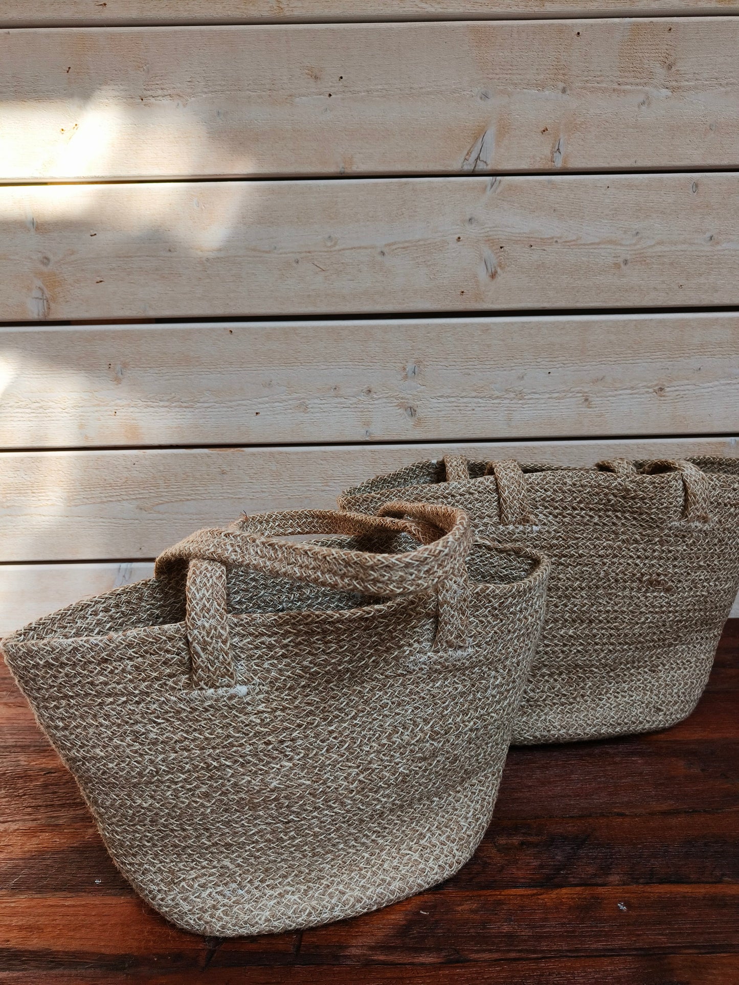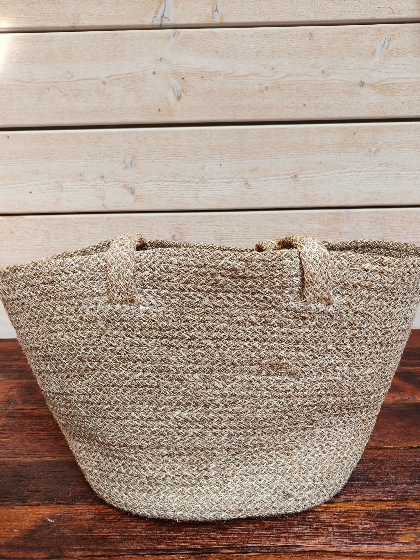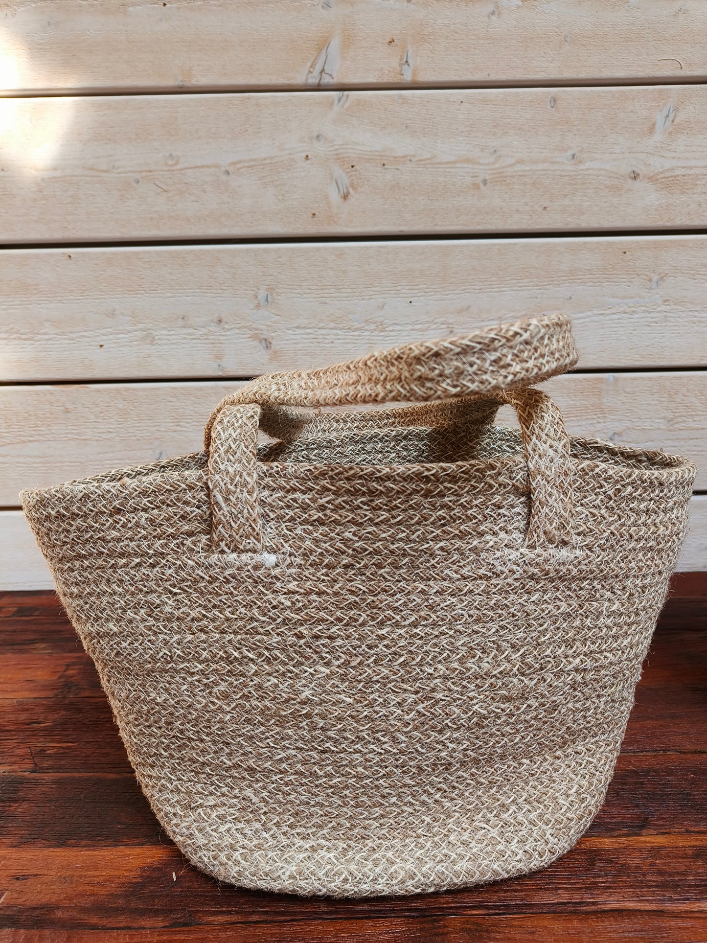 Jute basket for home storage, toilet paper, socks, spool of thread, shopping basket. Soft jute as material, long brackets, tapers downwards.