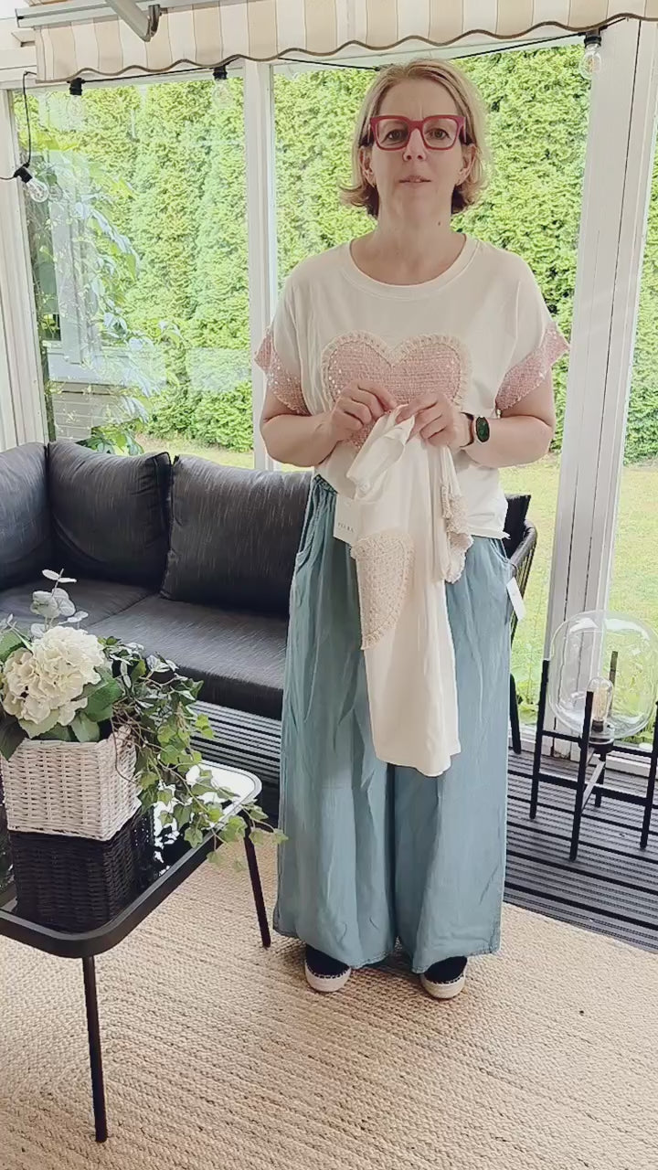 Glitter T-shirt with boho-style heart on the front, same glitter decoration on the sleeve cuffs, o-neckline, straight model, relaxed fit. One size.