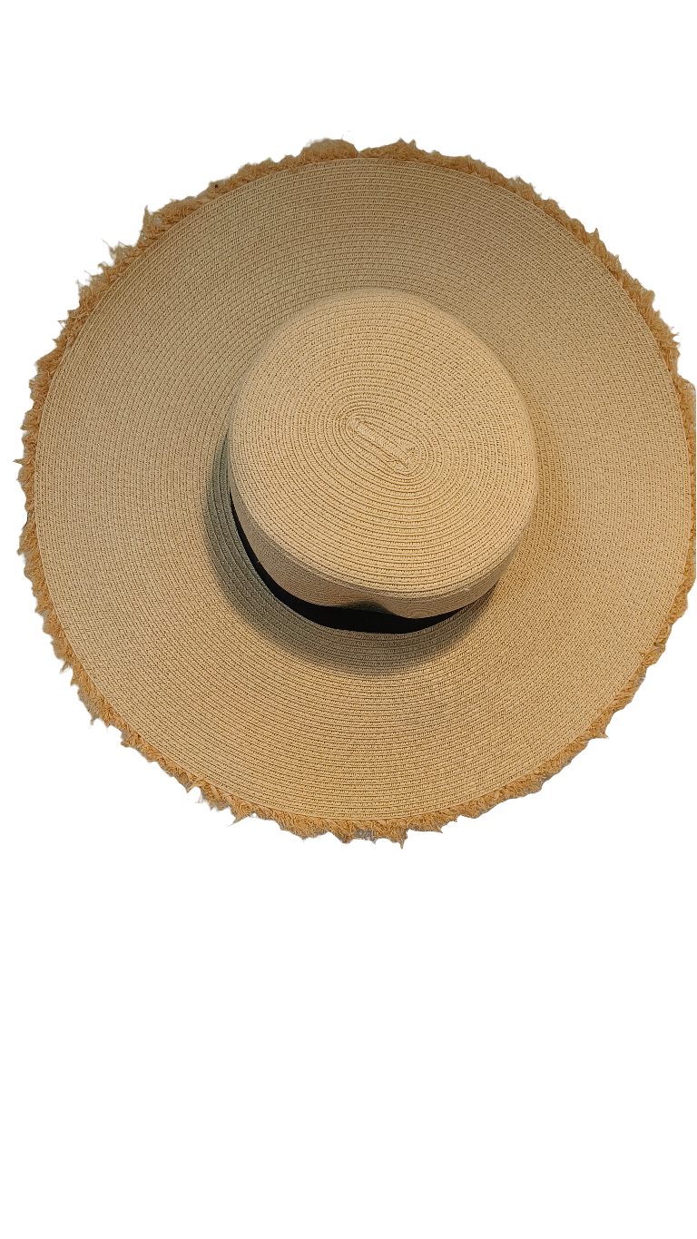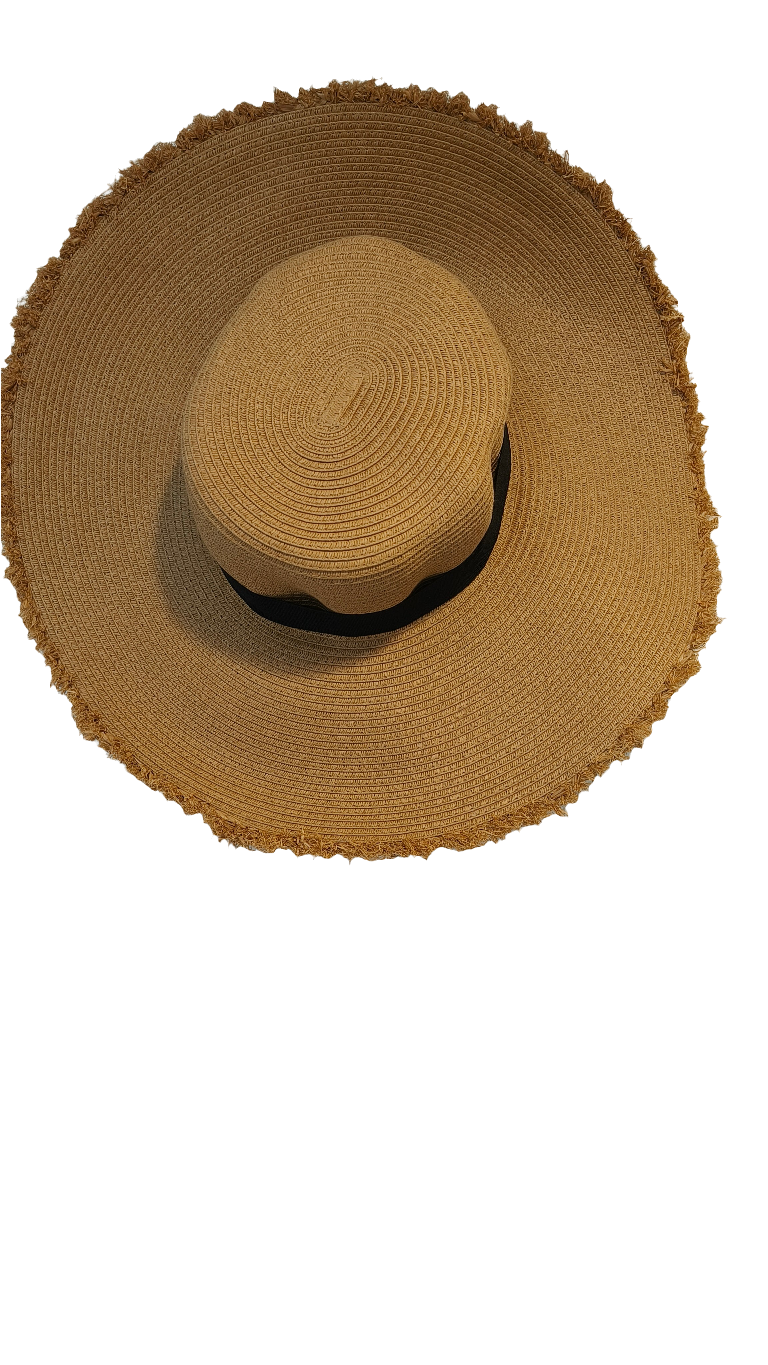 Tyylikäs aurinkohattu, leveä lieri, musta nauha hatun päällä ja sisäpuolella.