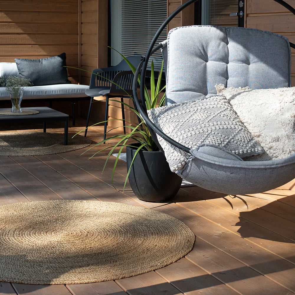 Pyöreä juuttimatto sopii esimerkiksi kodin eteis- ja aulatiloihin sekä oleskelutiloihin. Kokeile juuttimatto lasitetulle terassille tai parvekkeelle. Huom! Mattoa ei tulisi jättää sateeseen. Talvella sisätiloihin.