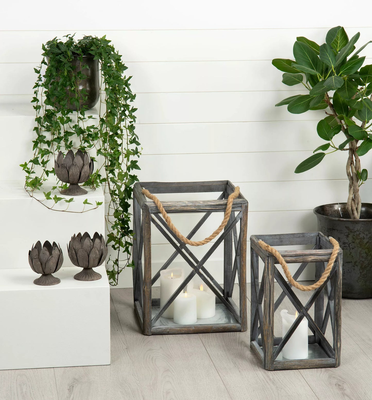 Näissä puisissa lyhdyissä on juuttiköysi, metallilevy pohjalla, lasi-ikkunat, painavat.