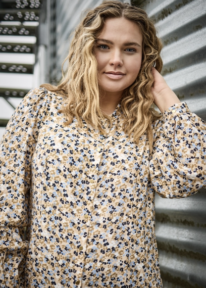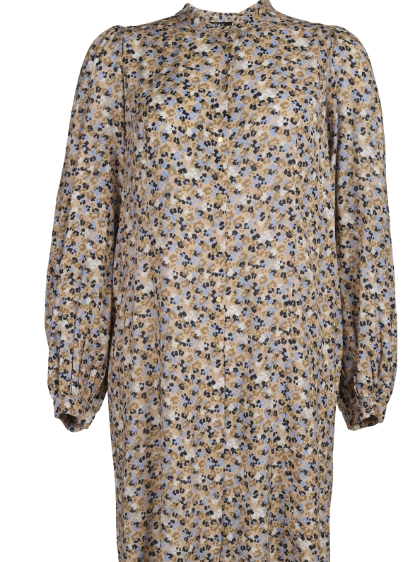 Josie mekko on kevyttä ja laskeutuvaa viskoosia, kaunis kukkakuosi beigen, mustan ja sinisen sävyjä, mikä luo pehmeän ja naisellisen ilmeen. Malliltaan mekko on löysä, rento istuvuus. Pyöreä pääntie, edessä kultaiset napit ja röyhelö, pussihiha.