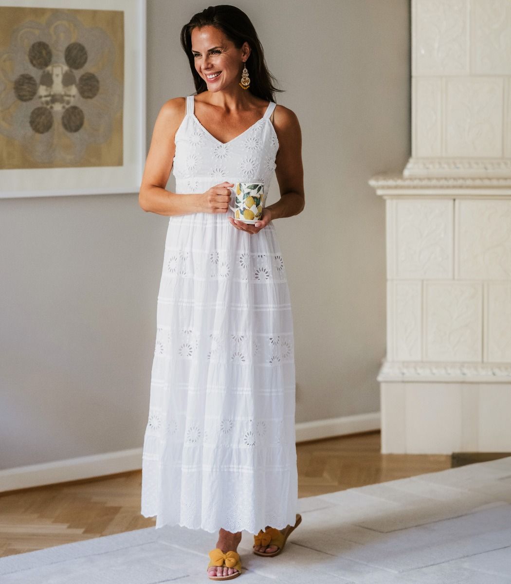 Lina mekko on brode anglais kangasta, jossa istuva yläosa sekä empire leikkaus, laskeutuva ja väljä alaosa. Kiinteä alushame.