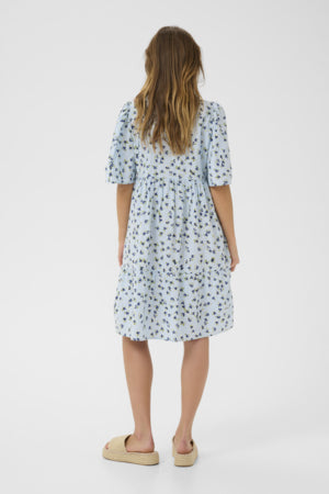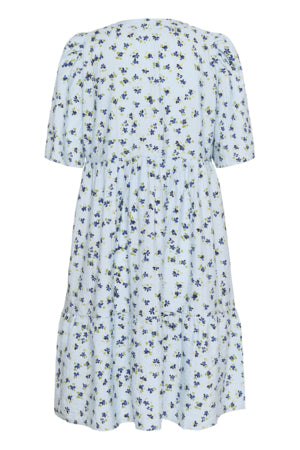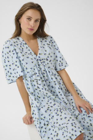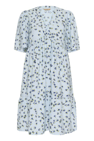 Puglia mekossa kaunis kukkaa printti, v-pääntie, a-linjainen, frilla helma, 1/2-hiha, rento istuvuus, pituus polven alle.