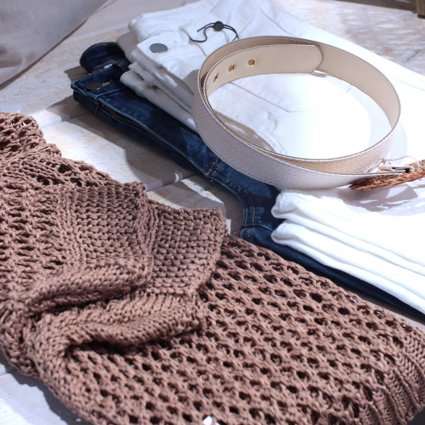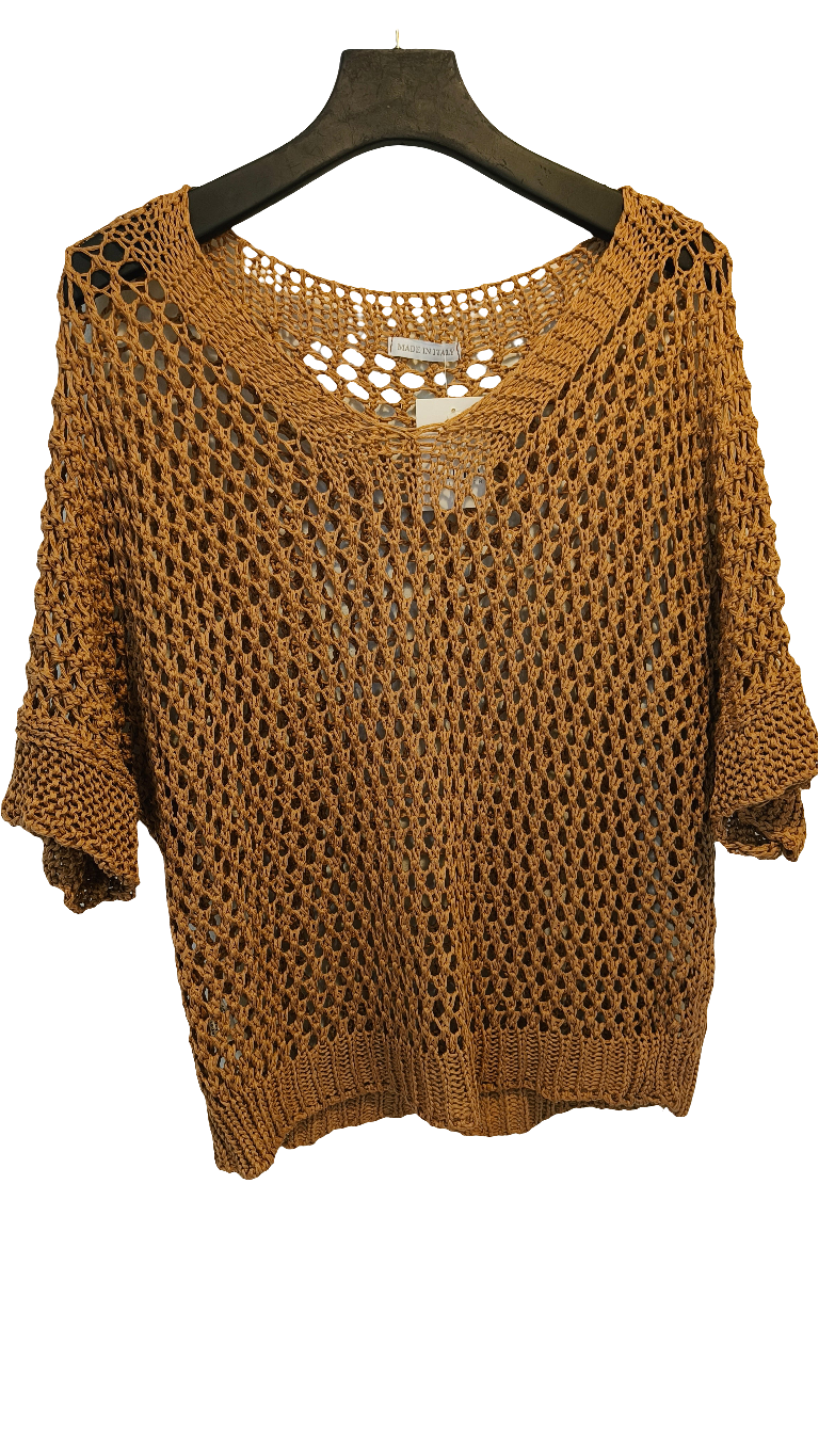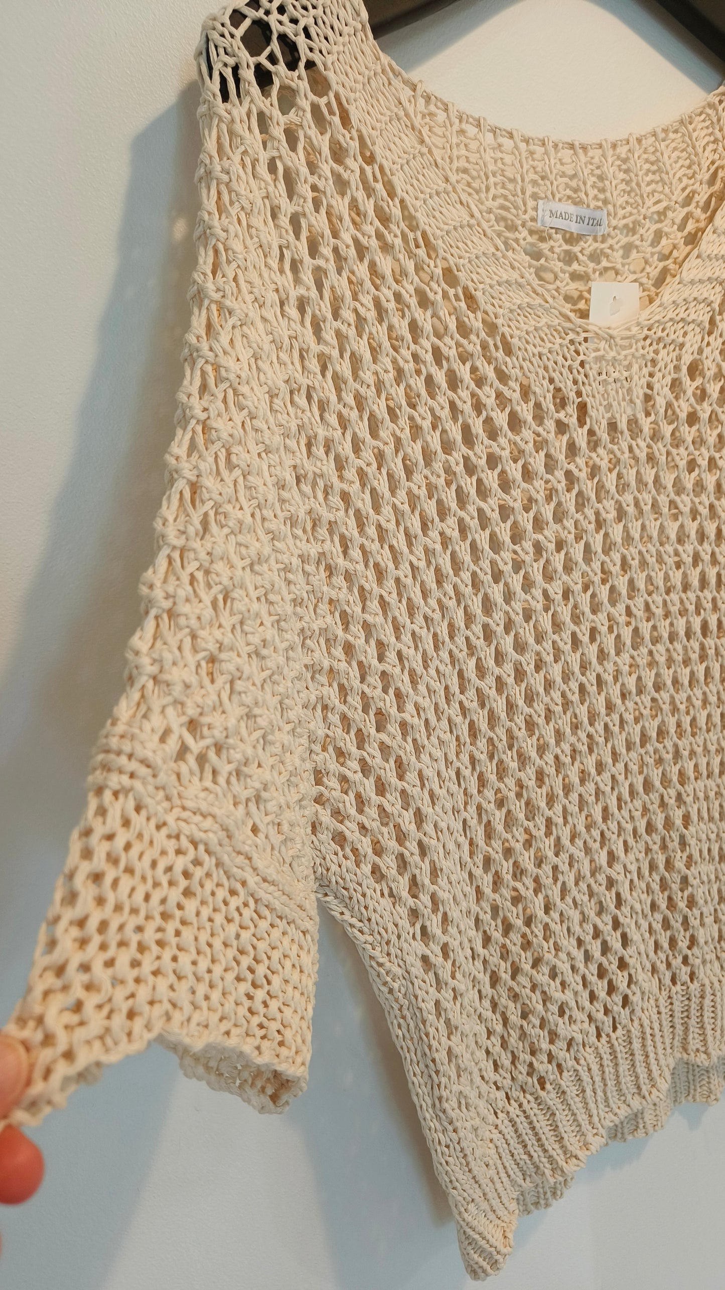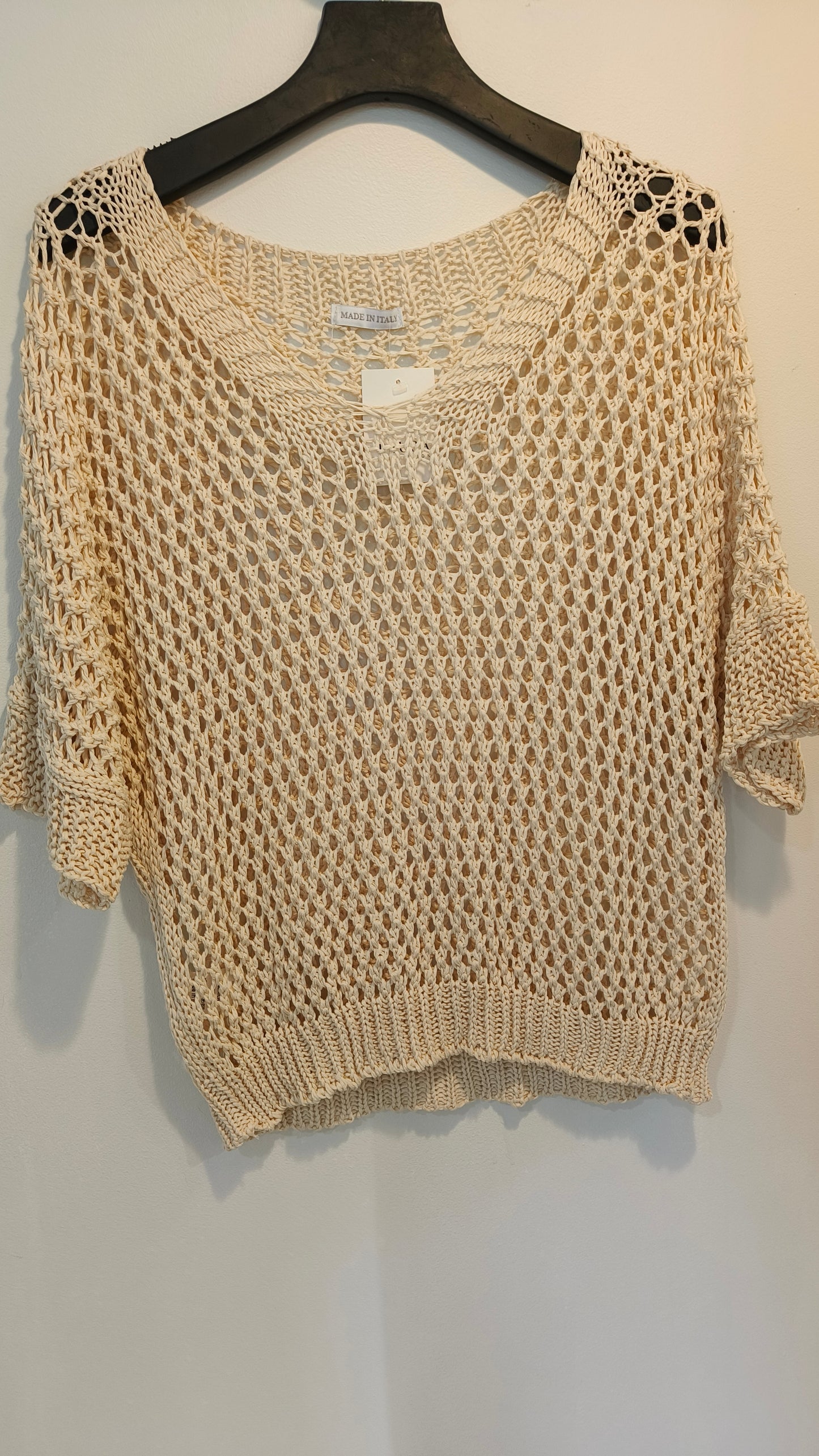 Reikäneule, lyhyt hiha, o-pääntie, resori hihansuissa ja helmassa, rento istuvuus, lyhyt. Yhden koon.