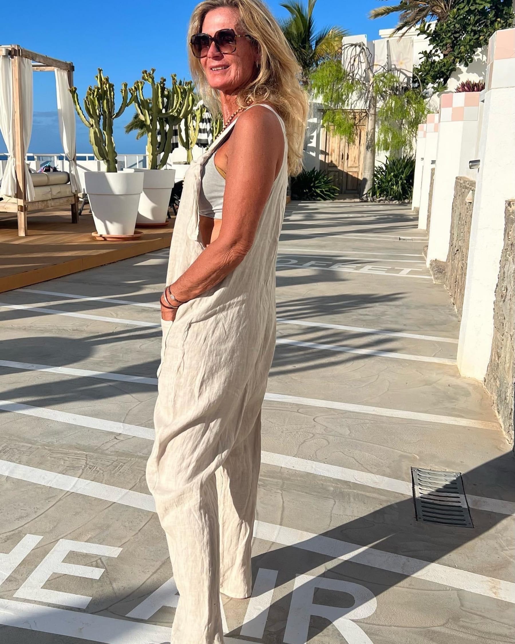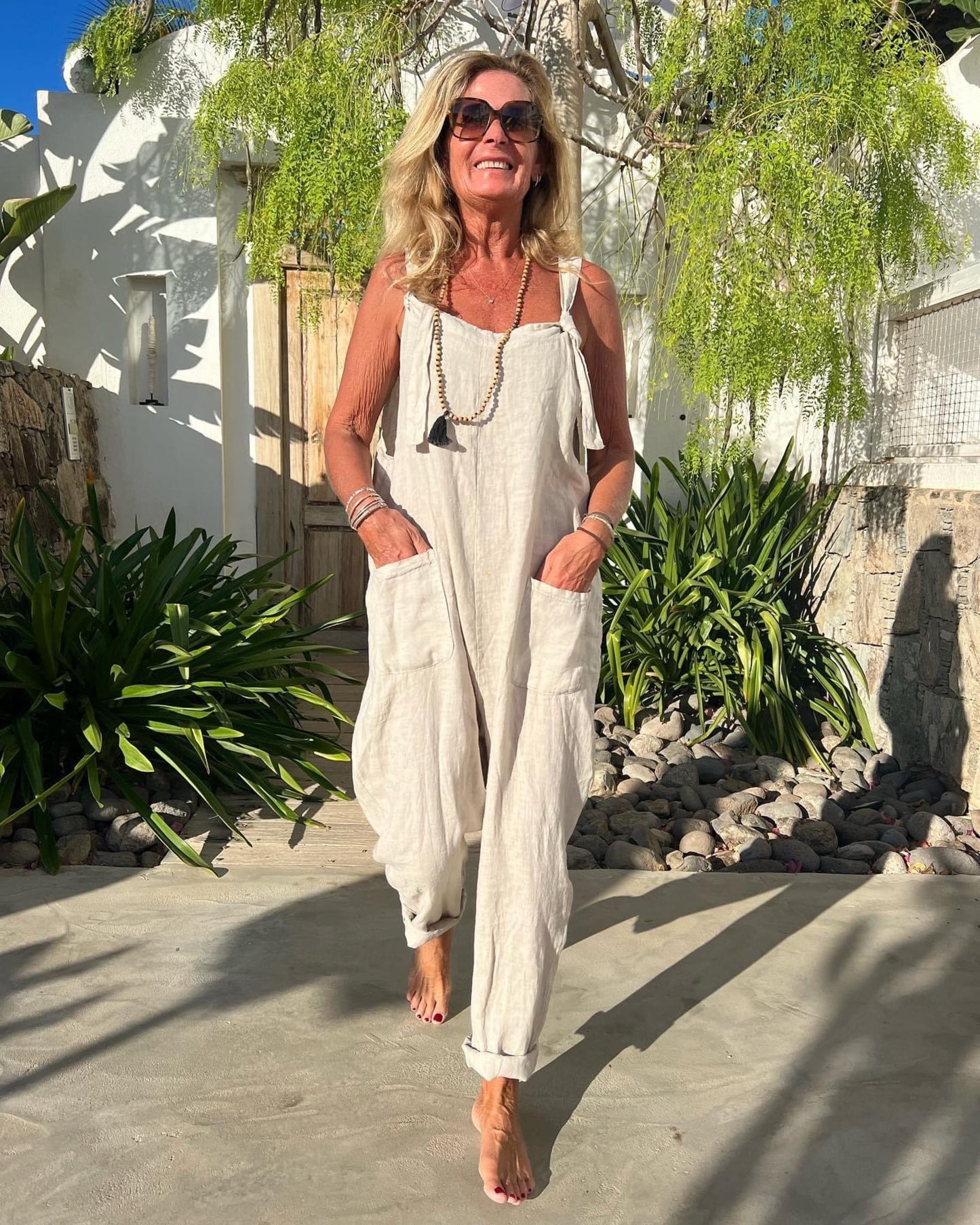 Pellavahaalari, jossa rento istuvuus, taskut edessä, solmittavat olkaimet.