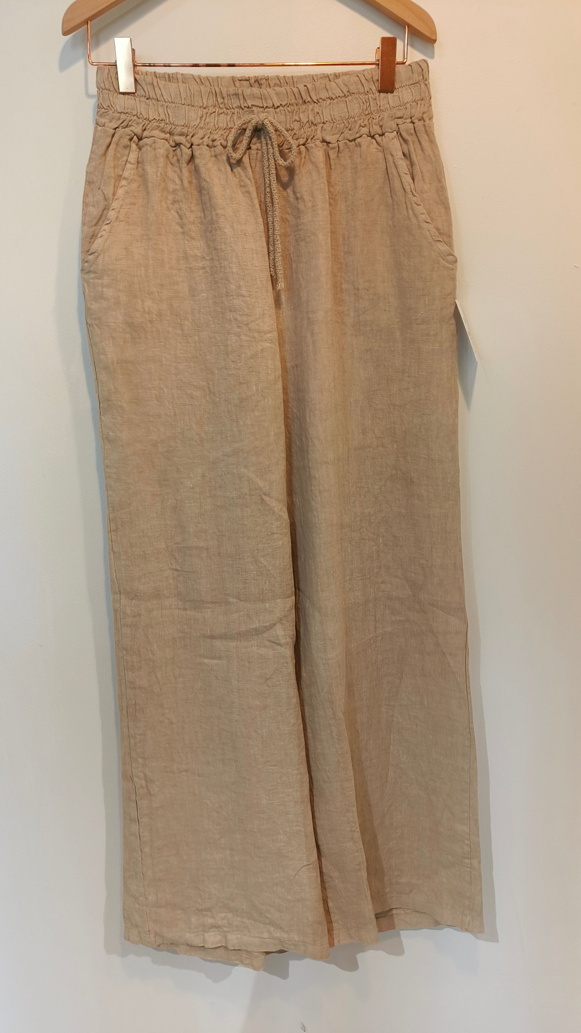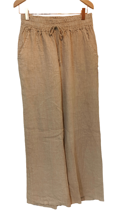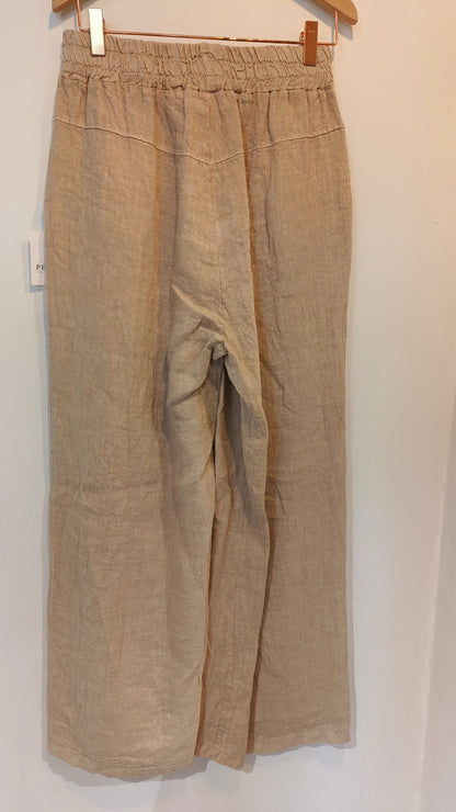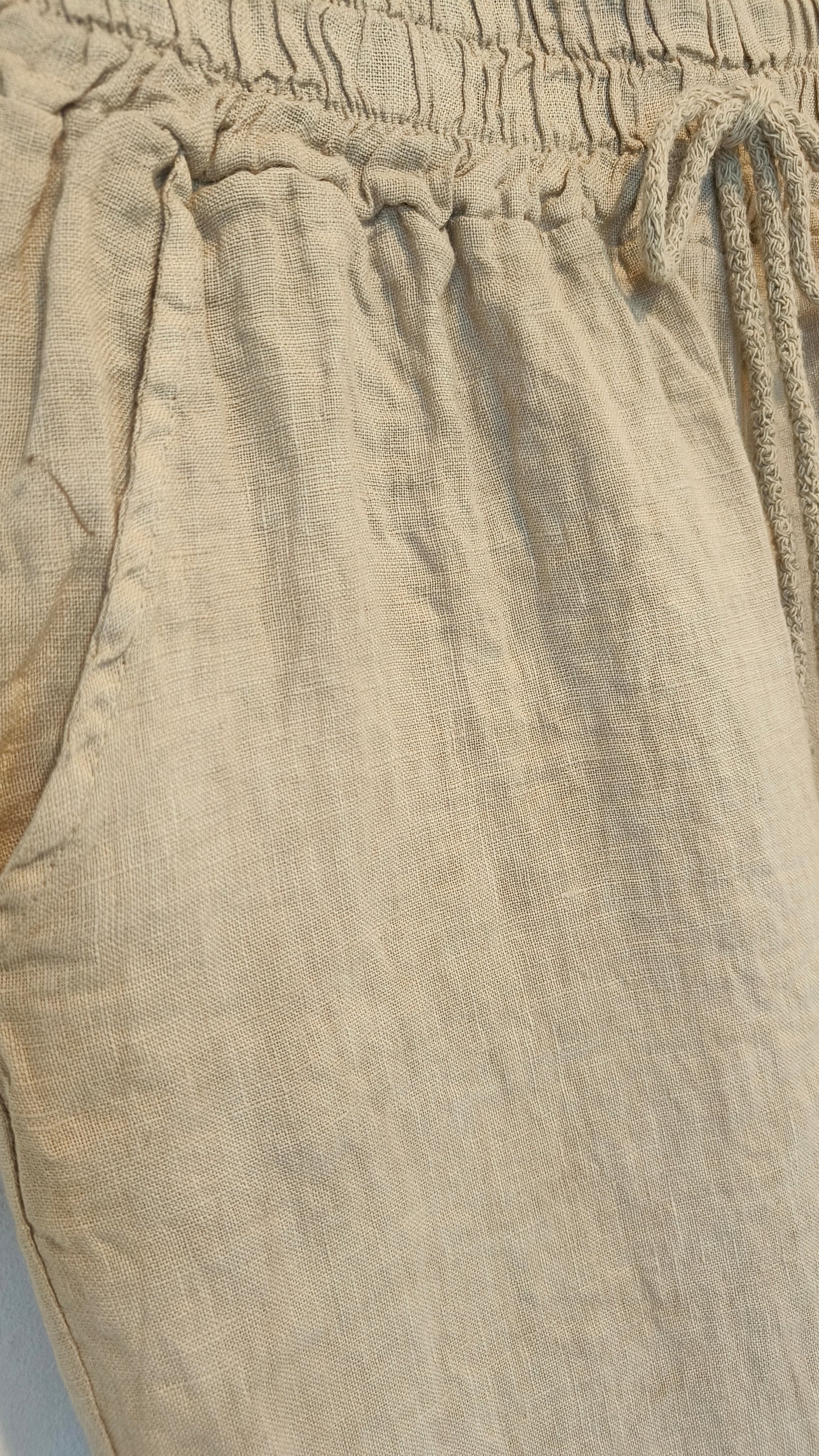 Mirella pellavahousussa kuminauha ja kiristysnyöri vyötäröllä, sivutaskut, väljä istuvuus.