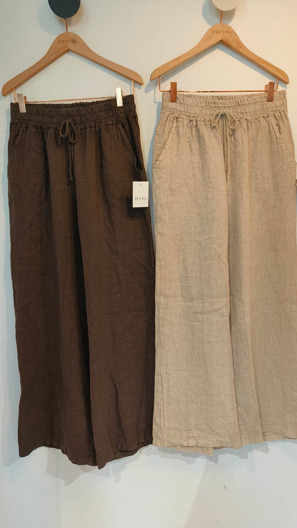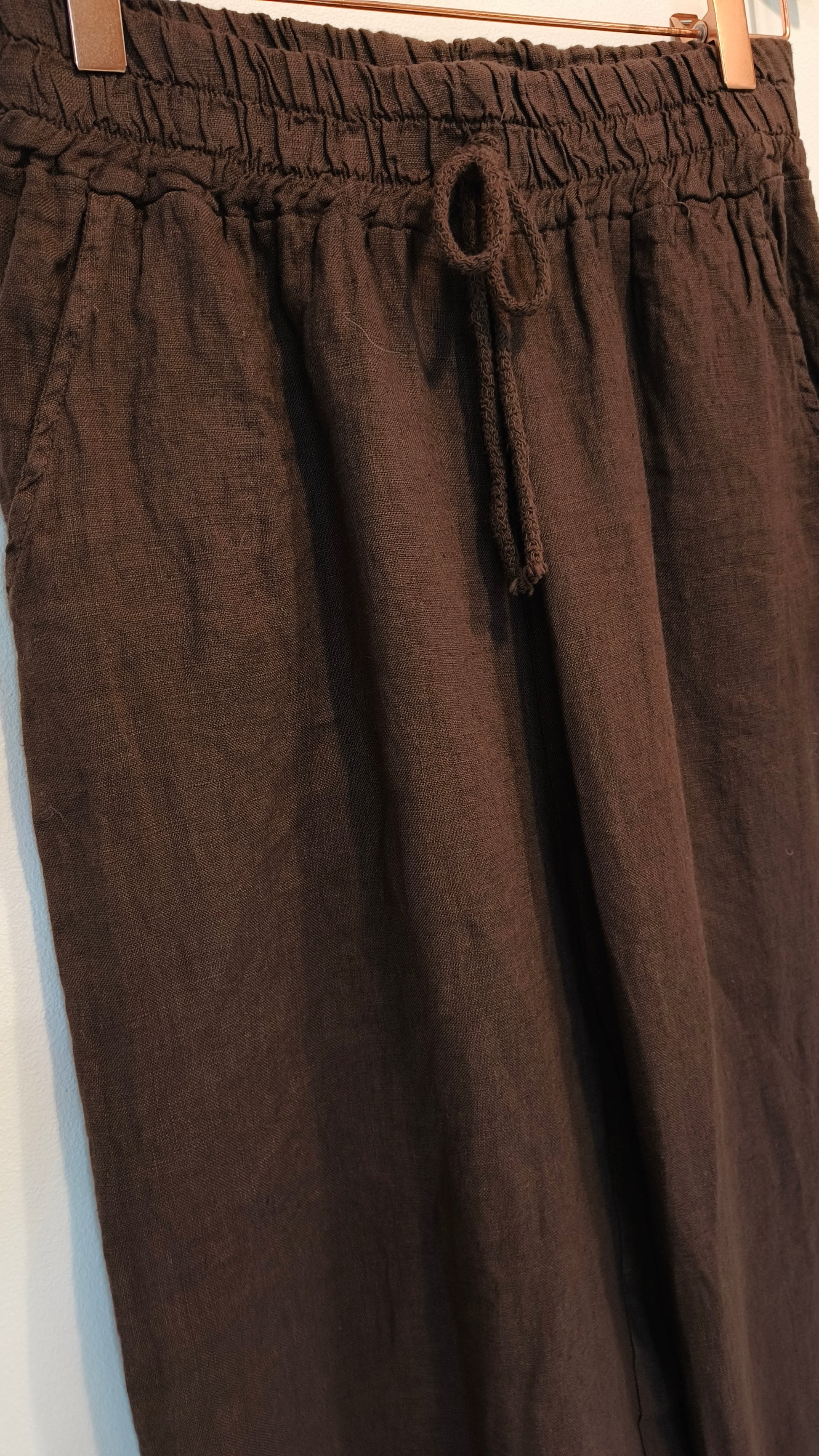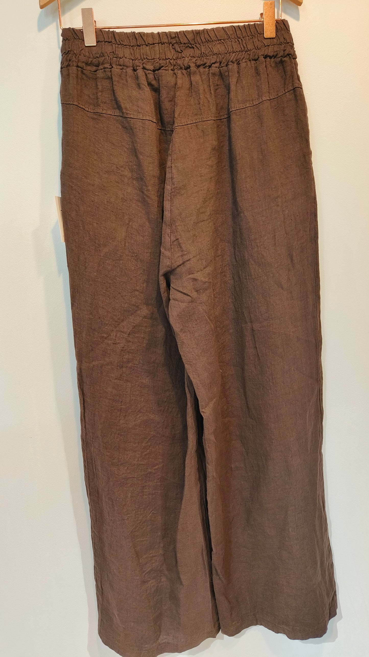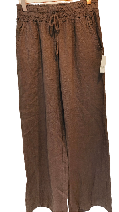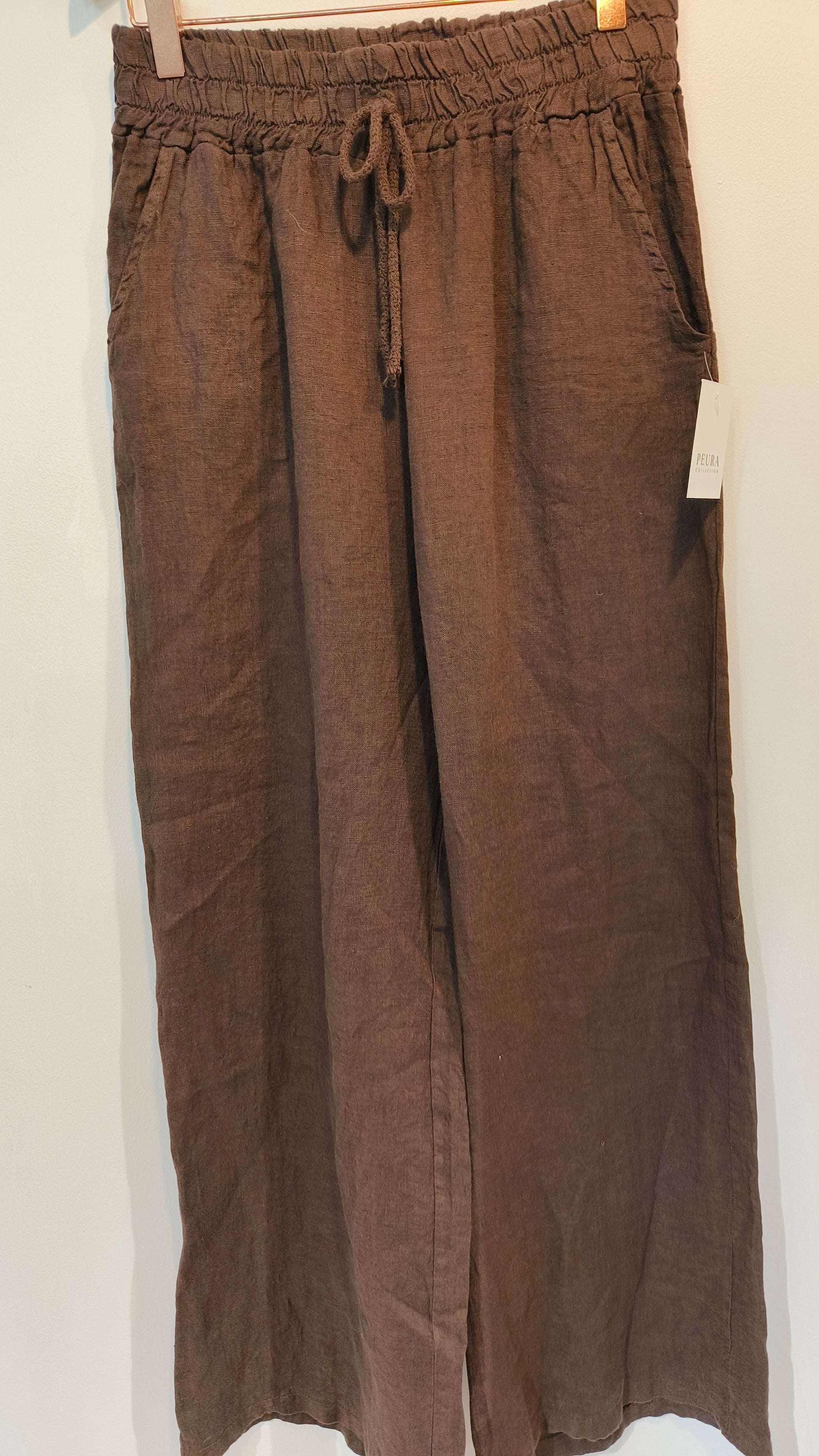 Mirella pellavahousussa kuminauha ja kiristysnyöri vyötäröllä, sivutaskut, väljä istuvuus.