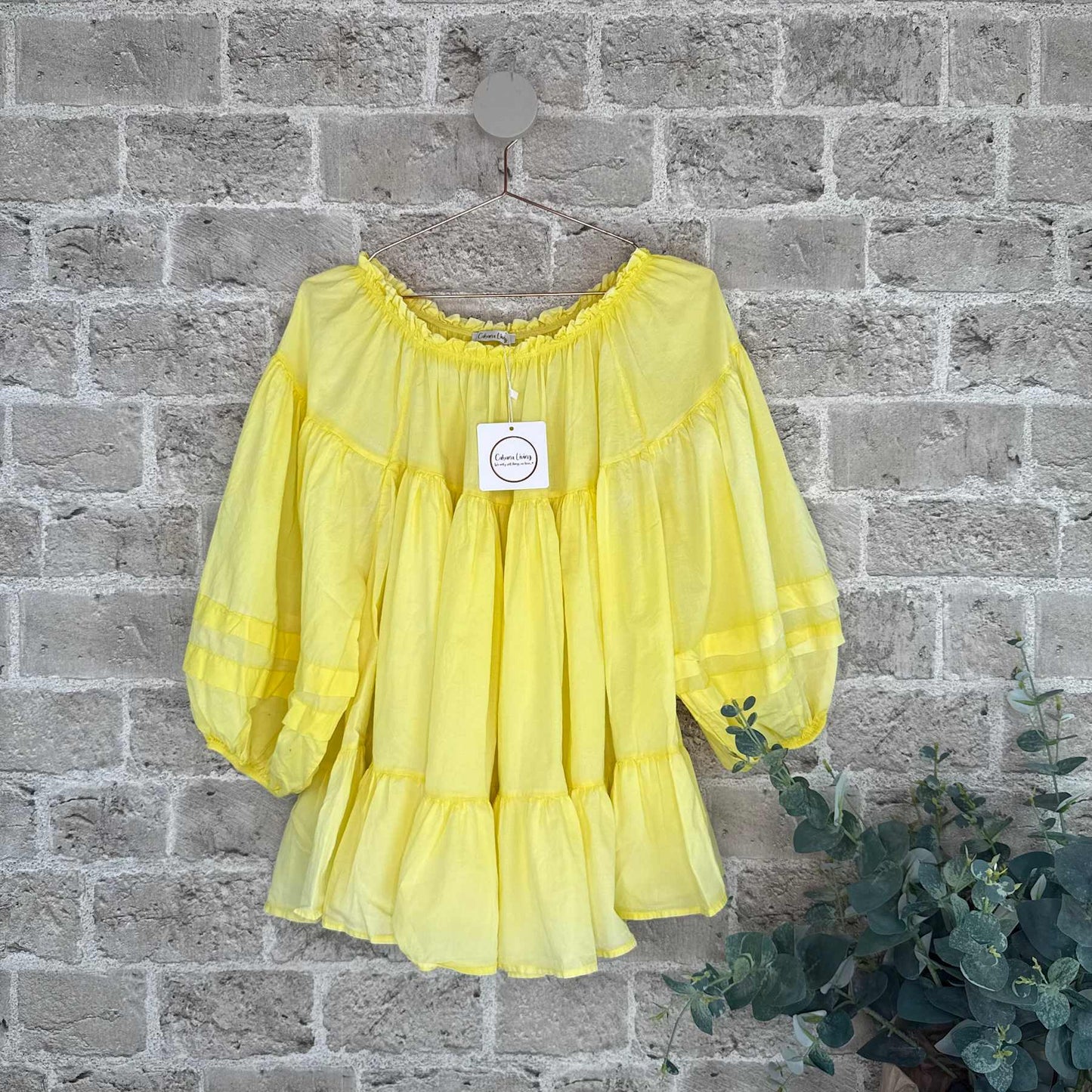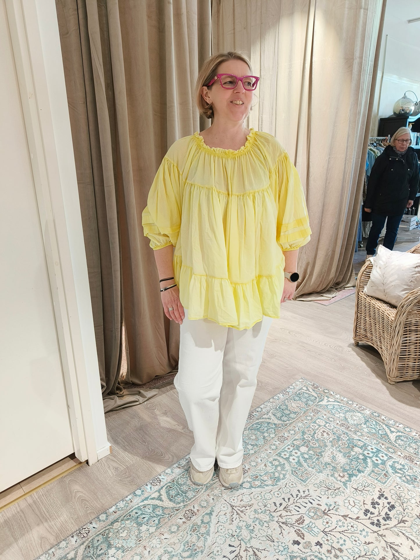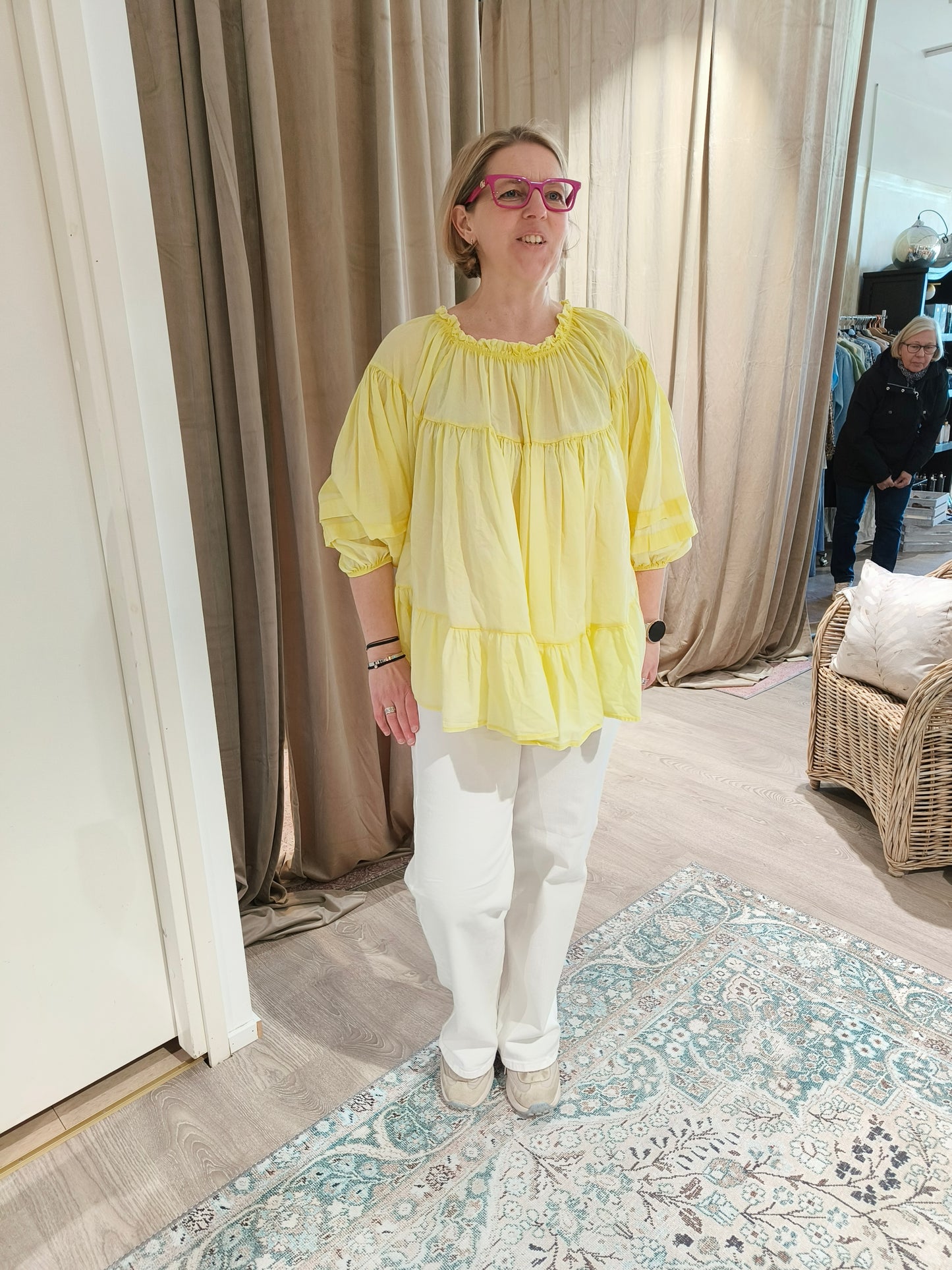 Frillahelmainen Kozy pusero, jossa offsholder pääntie, 3/4-osa hiha, joissa kuminauha. Yhdistä Karla farkun kanssa.
