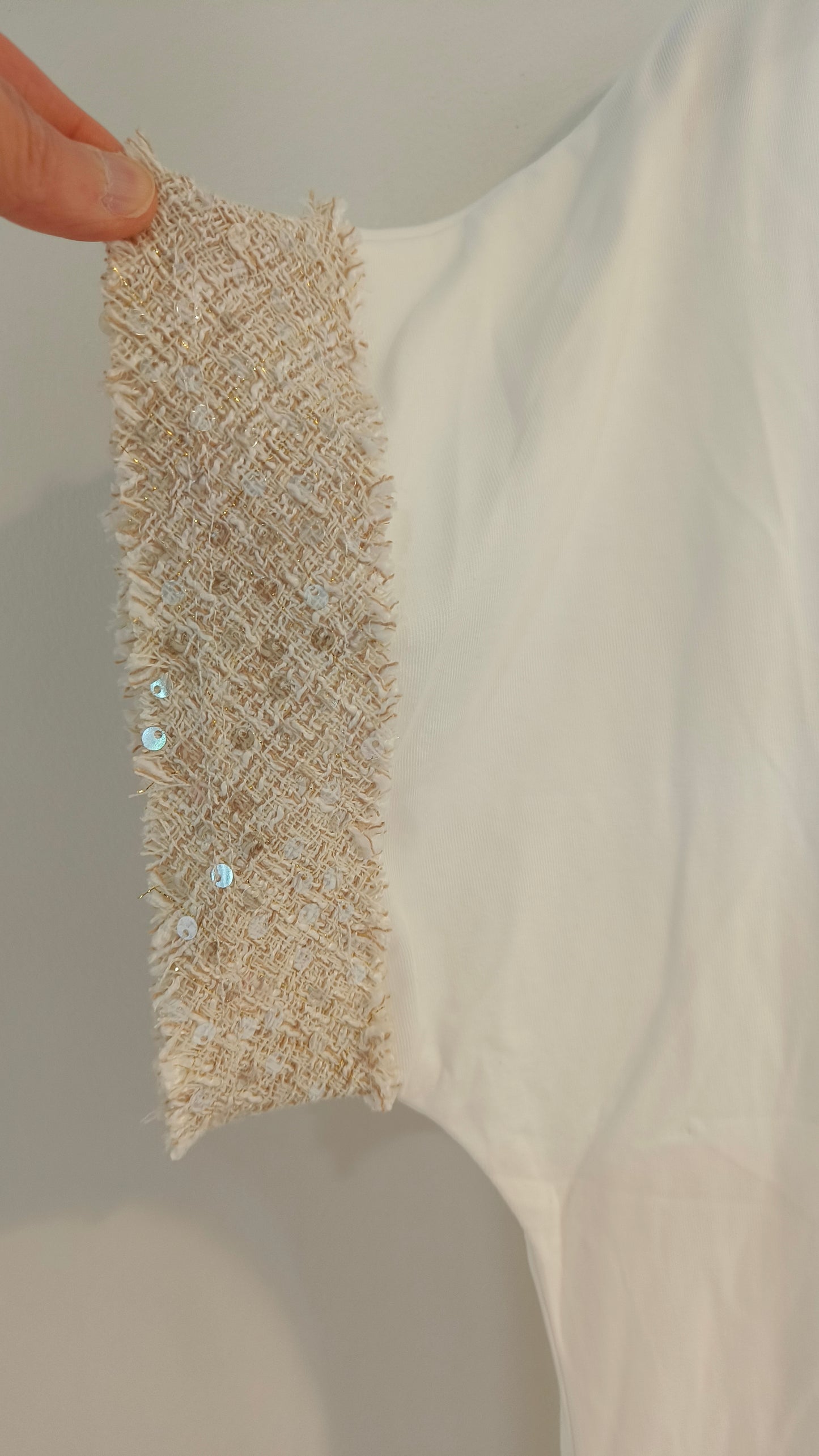 Glitter T-paidassa boho tyylinen sydän edessä, hihan suissa samaa glitteriä koristeena, o-pääntie, suora malli, rento istuvuus. Yhden koon.