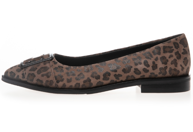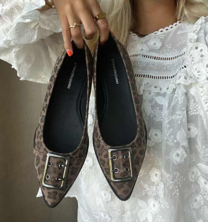 Feminina mockaballerinor med leopardmönster, silverspänne och spetsig tå. Skorna har en supermjuk innersula i latexskum.