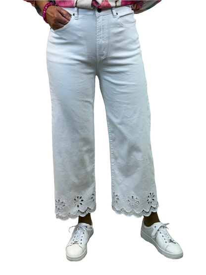 Jeans med broderi, raka 7/8-ben, fickor, dragkedja, normal passform, bälteshällor.