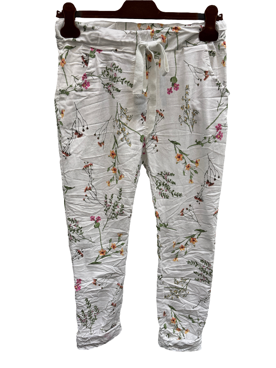 Superstretchiga byxor med smala ben, dragsko och resår i midjan samt sidfickor.