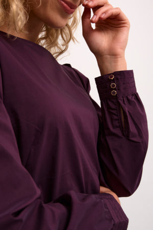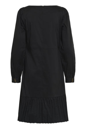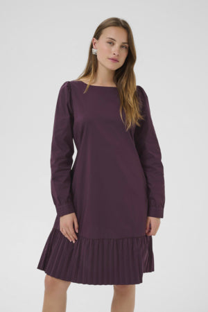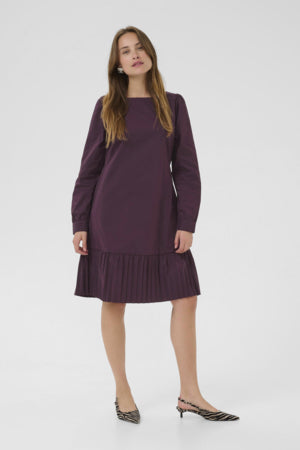 Beate-klänningen har en veckad nederkant, knälång, långa ärmar, avslappnad passform, stretchig