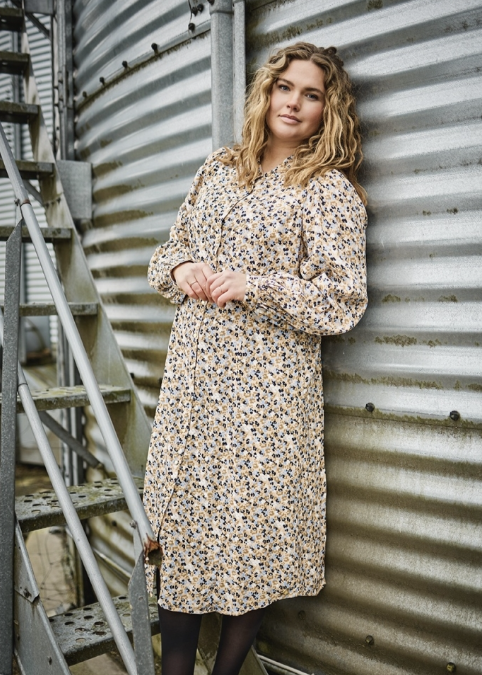 Josie klänningen är gjord av lätt och flytande viskos, med ett vackert blommönster i nyanser av beige, svart och blått, vilket skapar en mjuk och feminin look. Klänningen har en lös, avslappnad passform. Rund halsringning, guldknappar och volang framtill, puffärmar.
