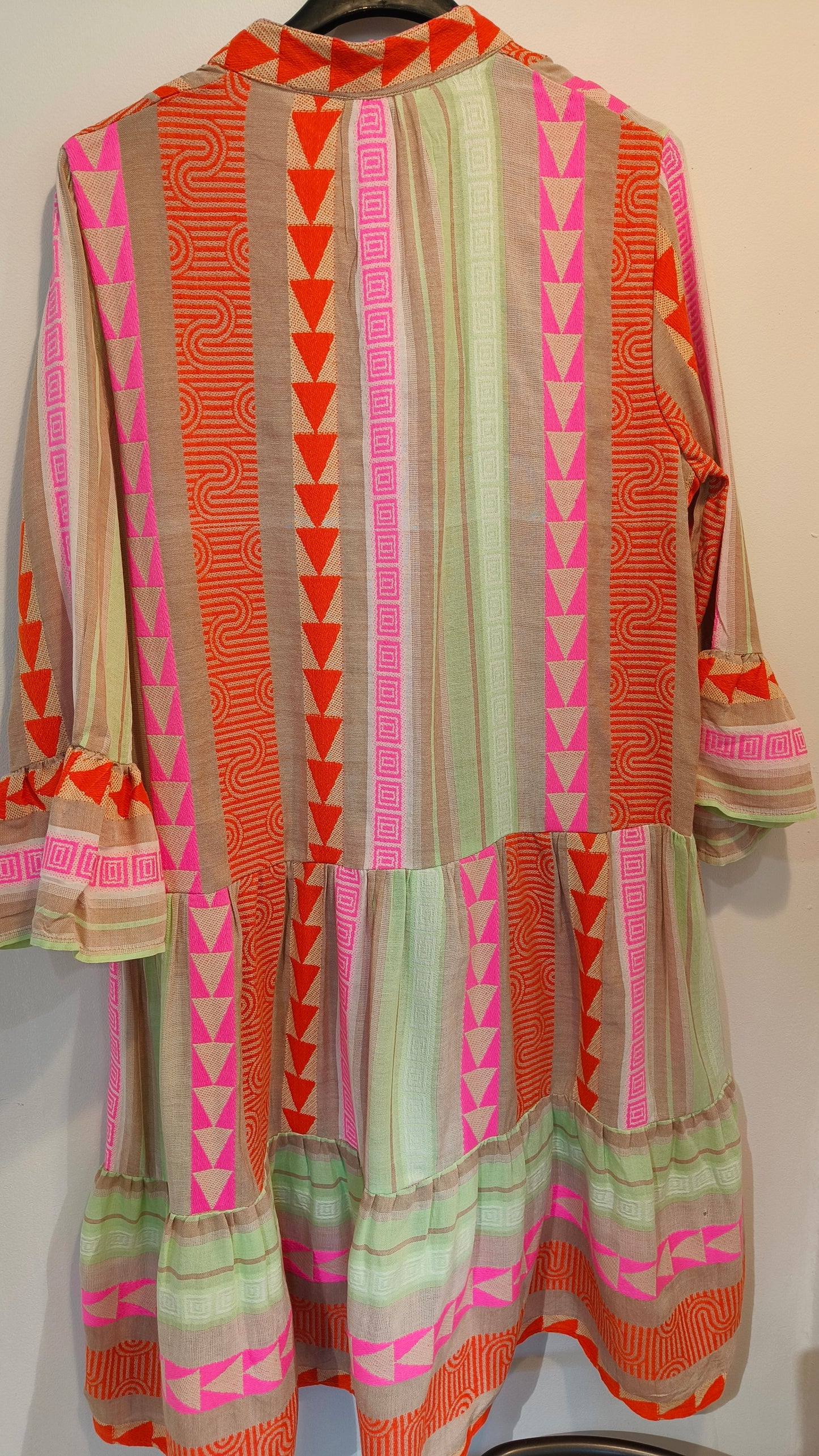 Klänningen är lös och bekväm att bära, med volanger i nederkant och ärmslut, v-ringning och knälång.