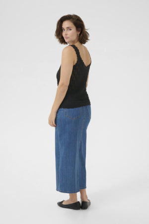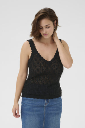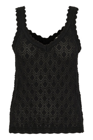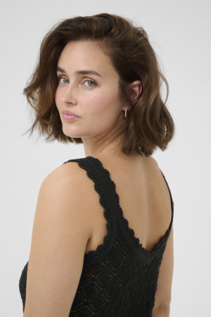 Trendig stickad topp med smala axelband, åtsittande och v-ringad. Kombinera med kjol eller byxor.