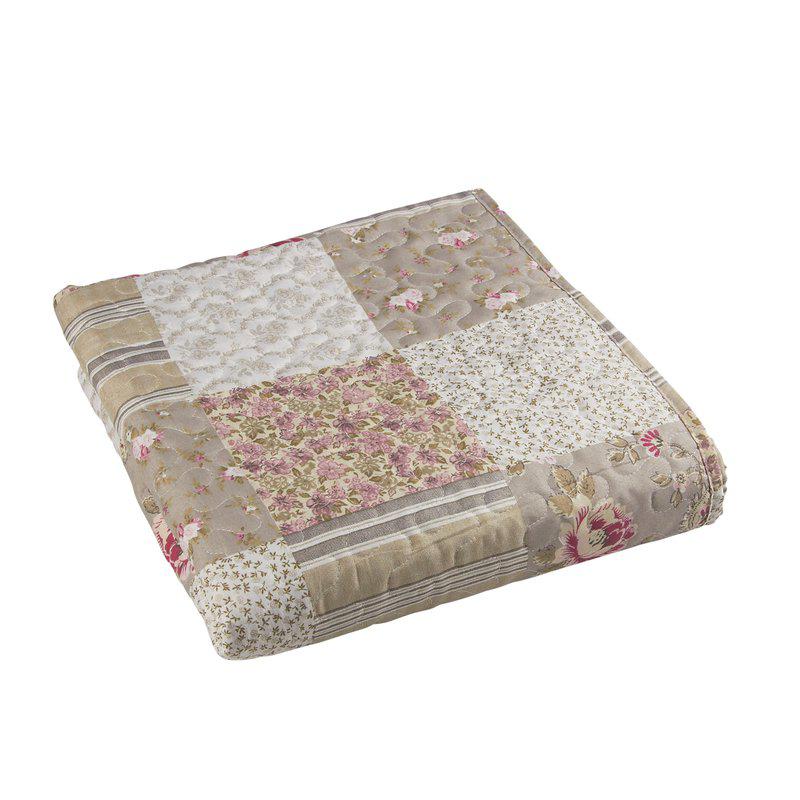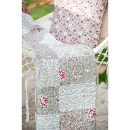 Rustikt romantiskt rosmönstrat quiltat överkast, lätt att lägga på sängen.