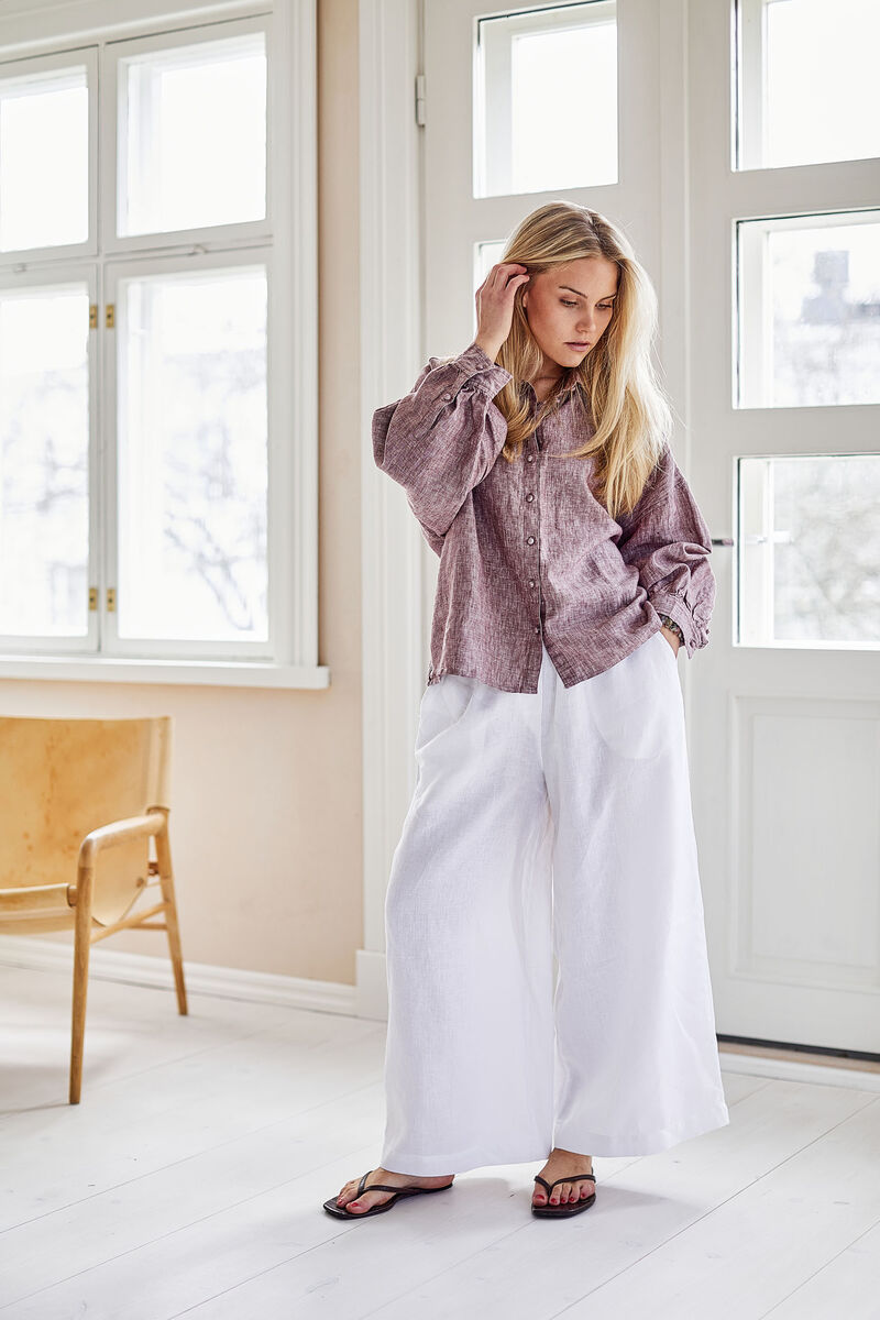 Martha linnetopp är ett avslappnat val med både byxor och kjolar. Skjortan har sänkta axlar, generösa halvlånga ärmar, en avslappnad passform och klädda knappar. En storlek. Kombinera culottes med linnebyxor .
