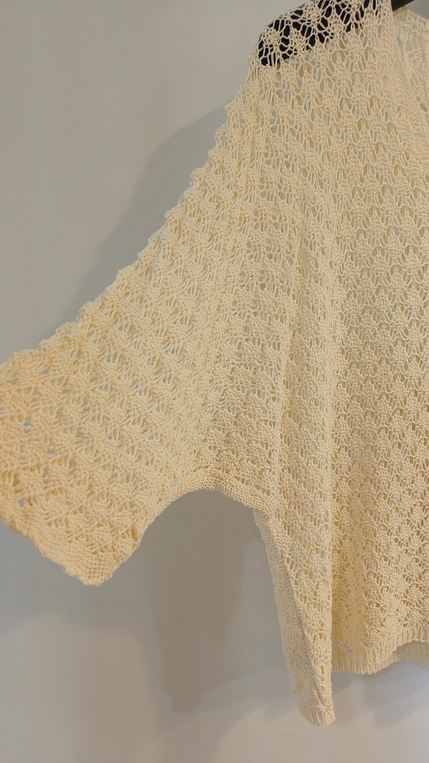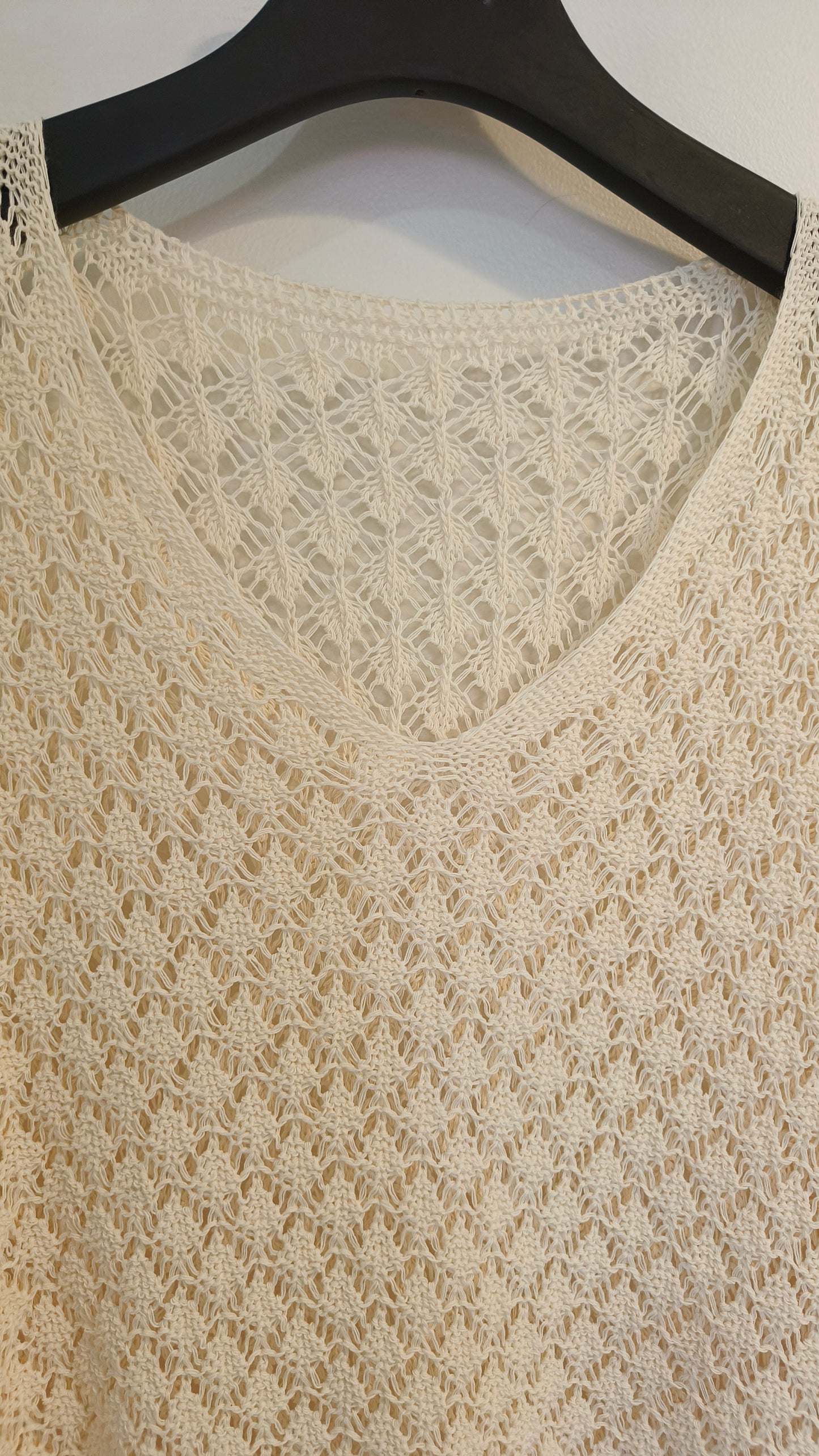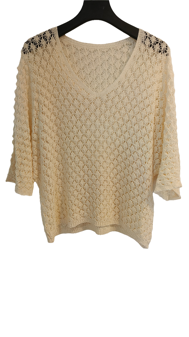 Spetsstickad tröja med v-ringning, 3/4-ärmar, smal resår i nederkanten, avslappnad passform. Topp att bära under en stickad tröja eller över en klänning. One size.