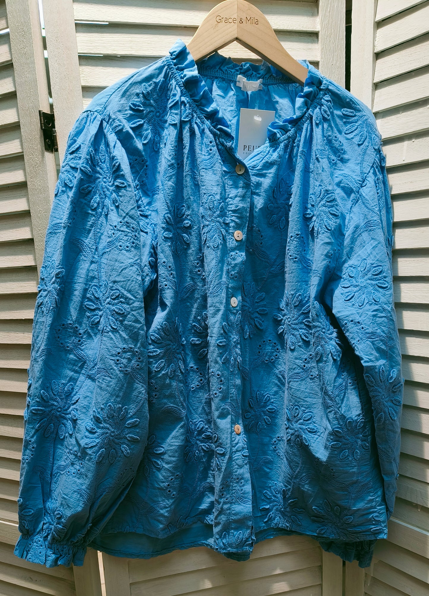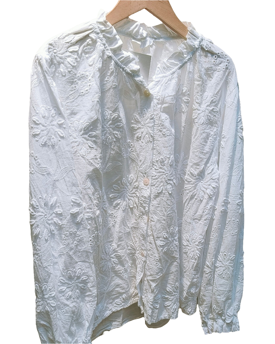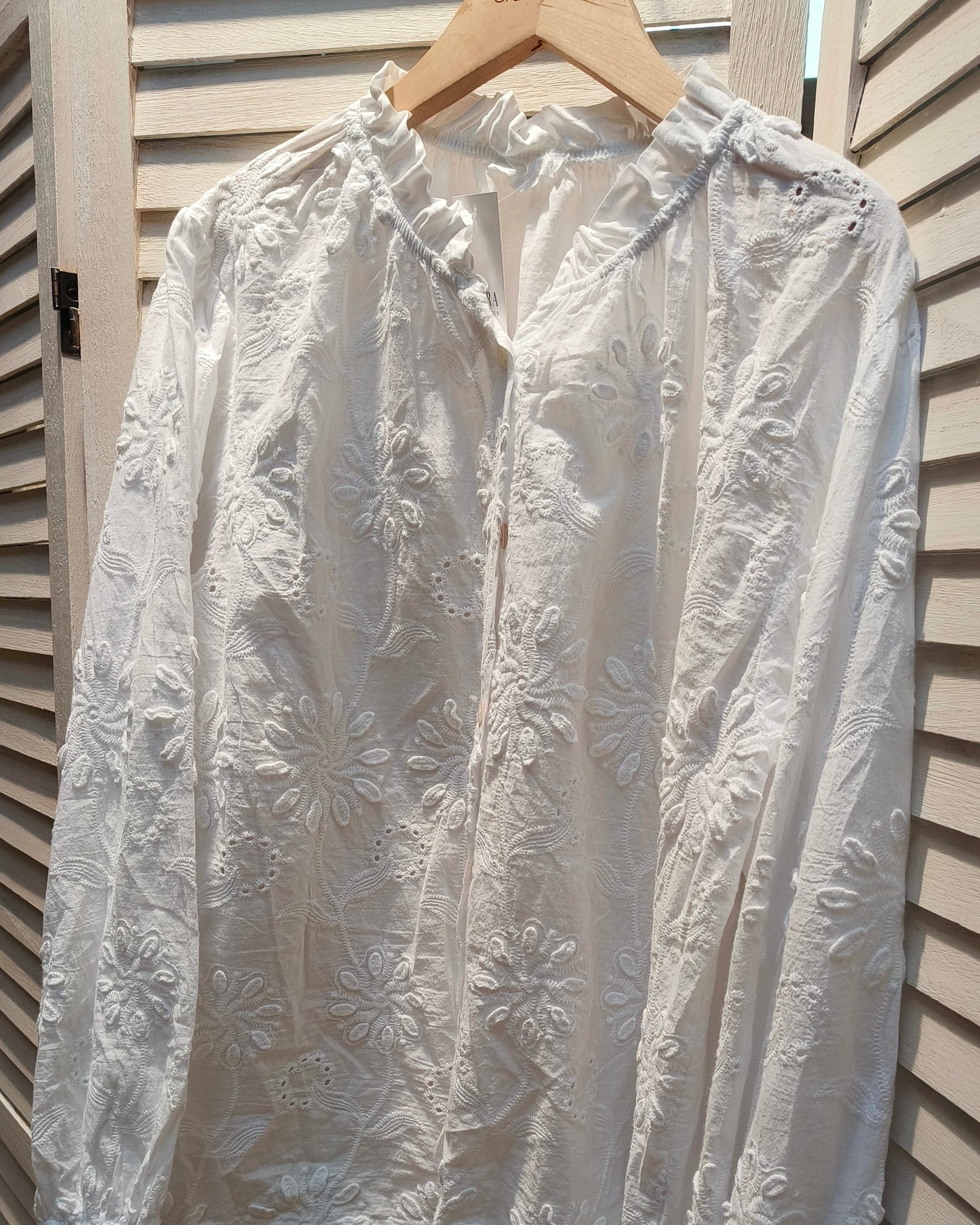 Trendig brode anglais blus med resår vid halsringning och ärmslut, knappstängning, lös passform. En storlek.