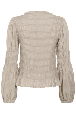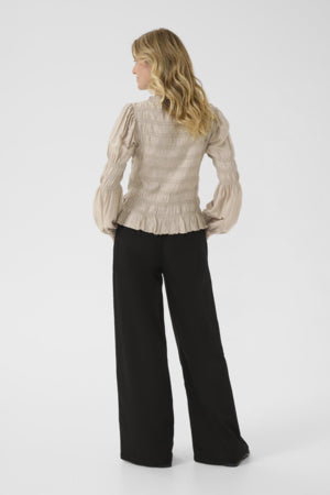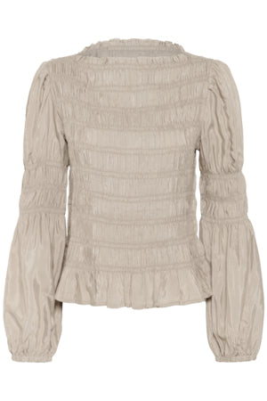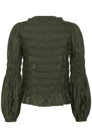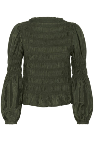 Stretchig blus, feminin skärning, långa puffärmar, båtringning, volangkant
