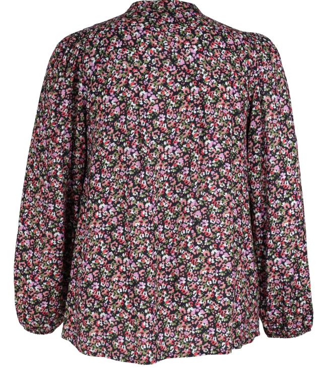 Josie i viskosblus, v-ringad, vackert småblommigt mönster, lös passform, resår vid ärmslut.