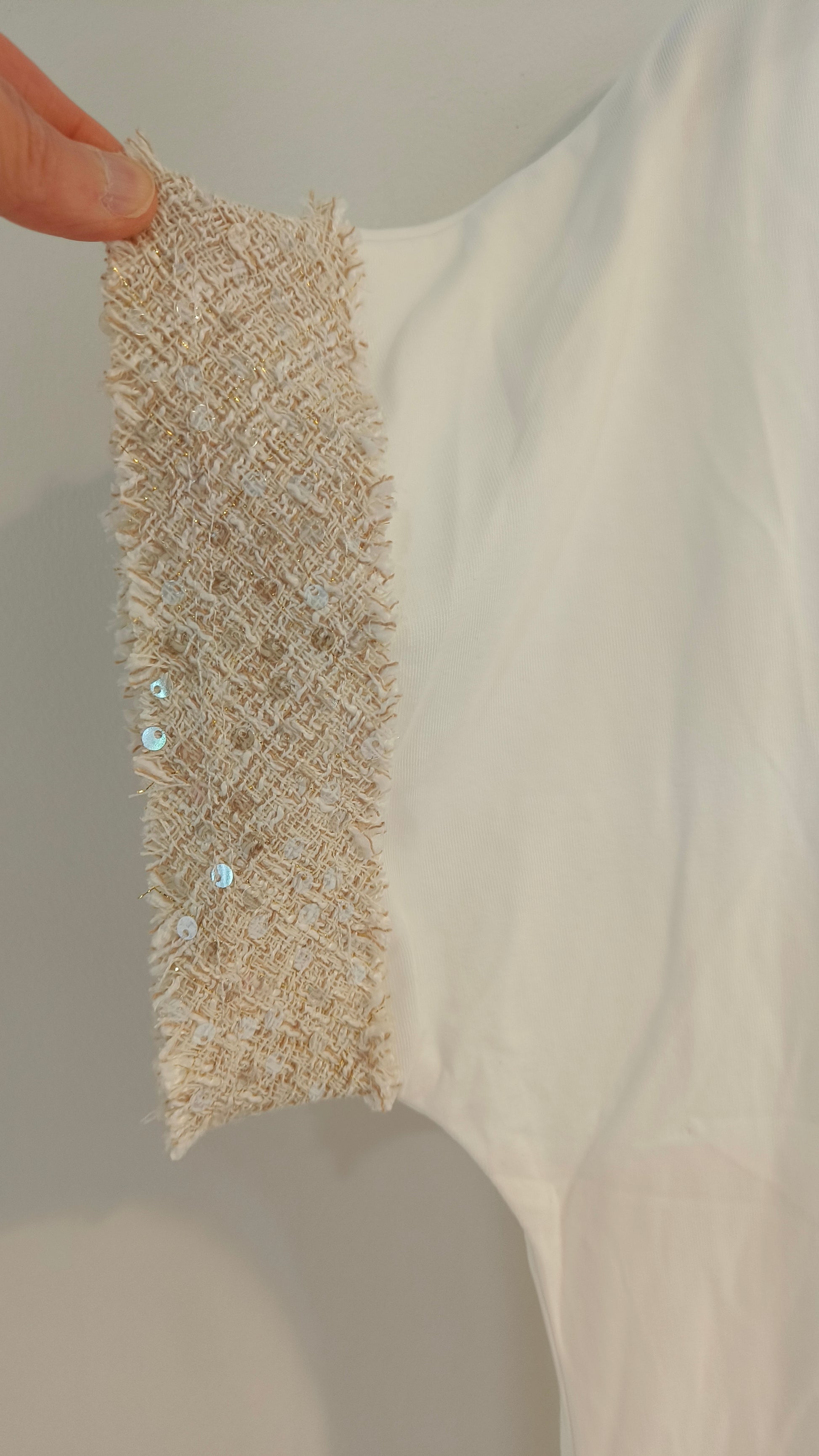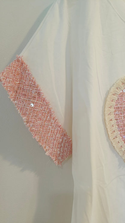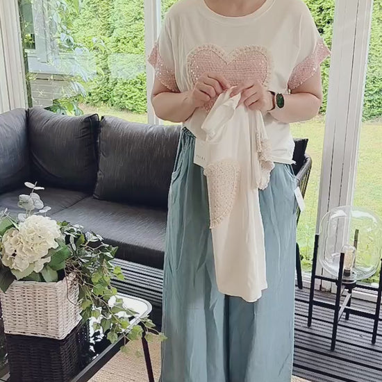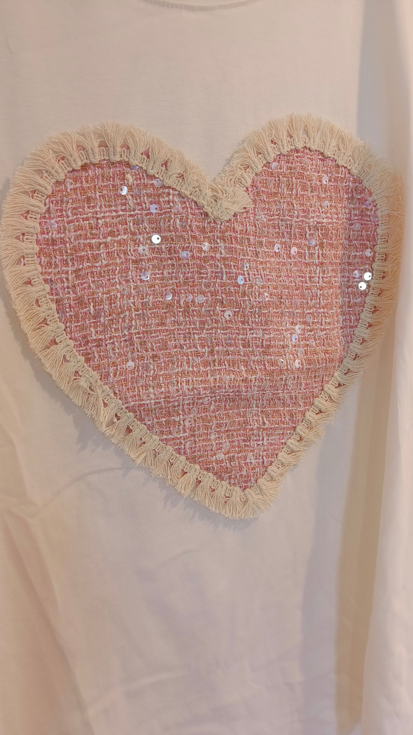 Glittrig t-shirt med bohemiskt hjärta framtill, samma glitterdekoration på ärmsluten, o-ringning, rak modell, avslappnad passform. One size.