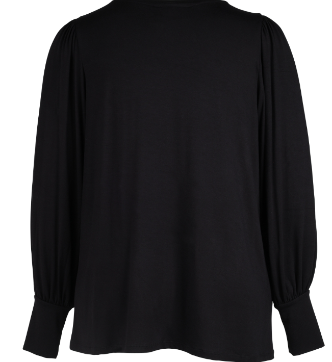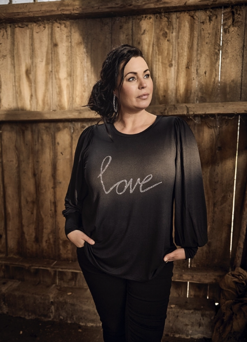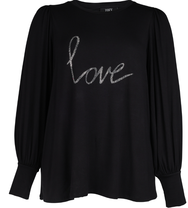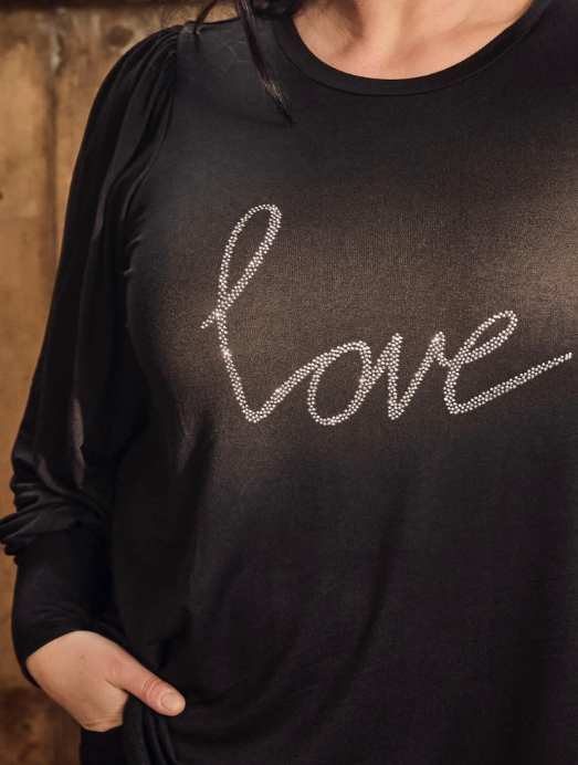 Långärmad T-shirt med "Love" i metallnubbar, muddar vid ärmslut som ger ärmvolym, A-linje som ger blusen extra komfort.