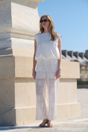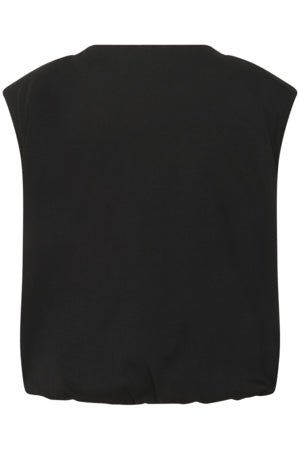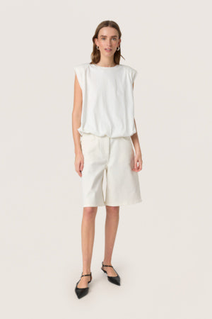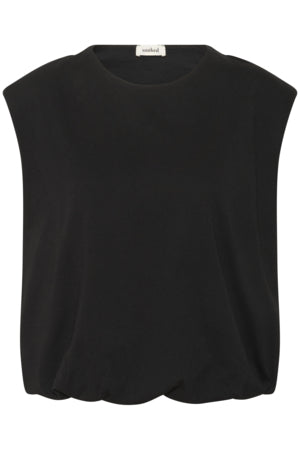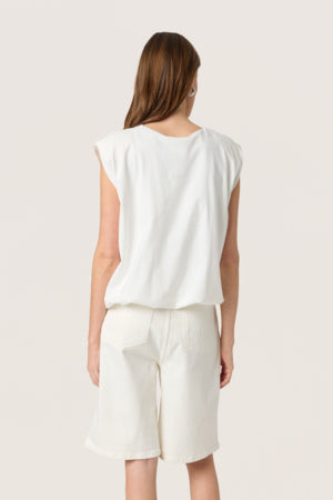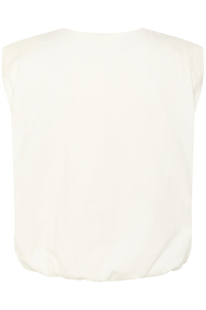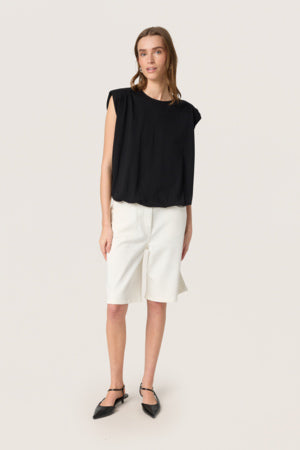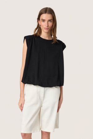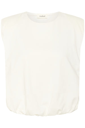 Puffig topp, axelvaddar, rund halsringning, avslappnad passform.