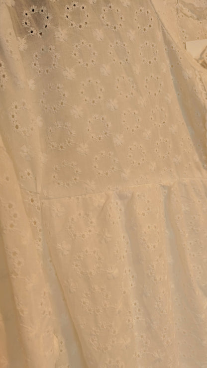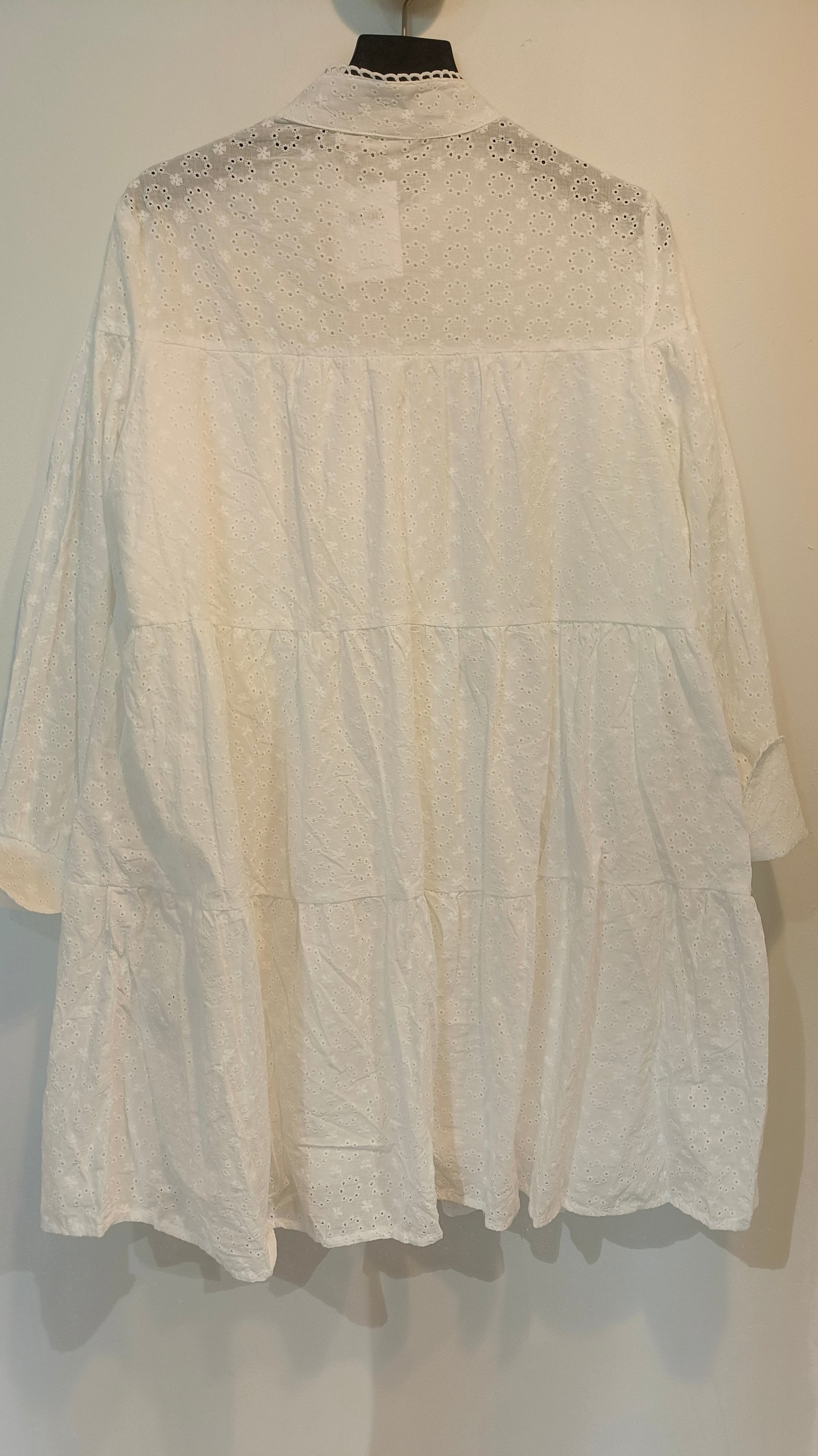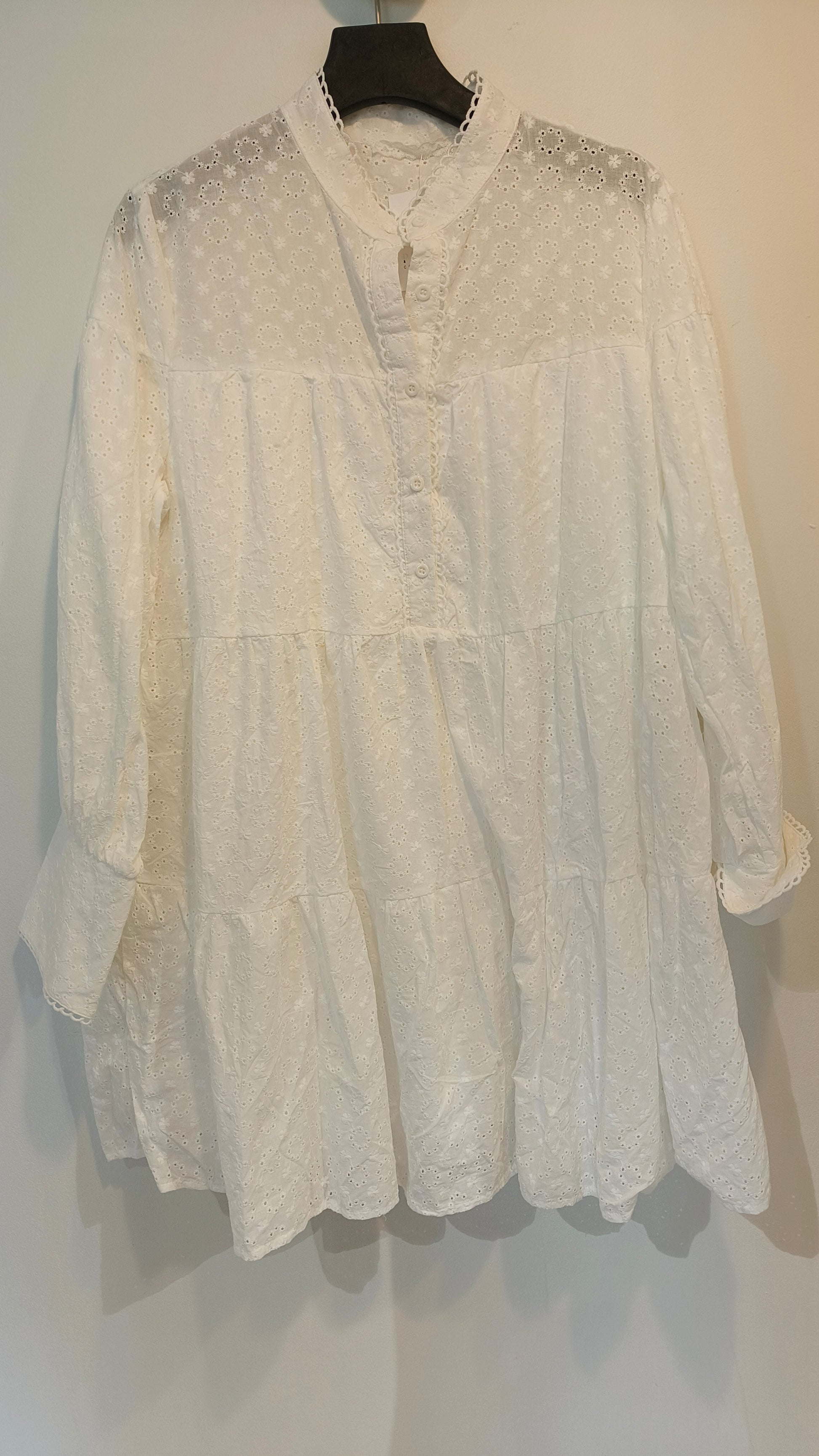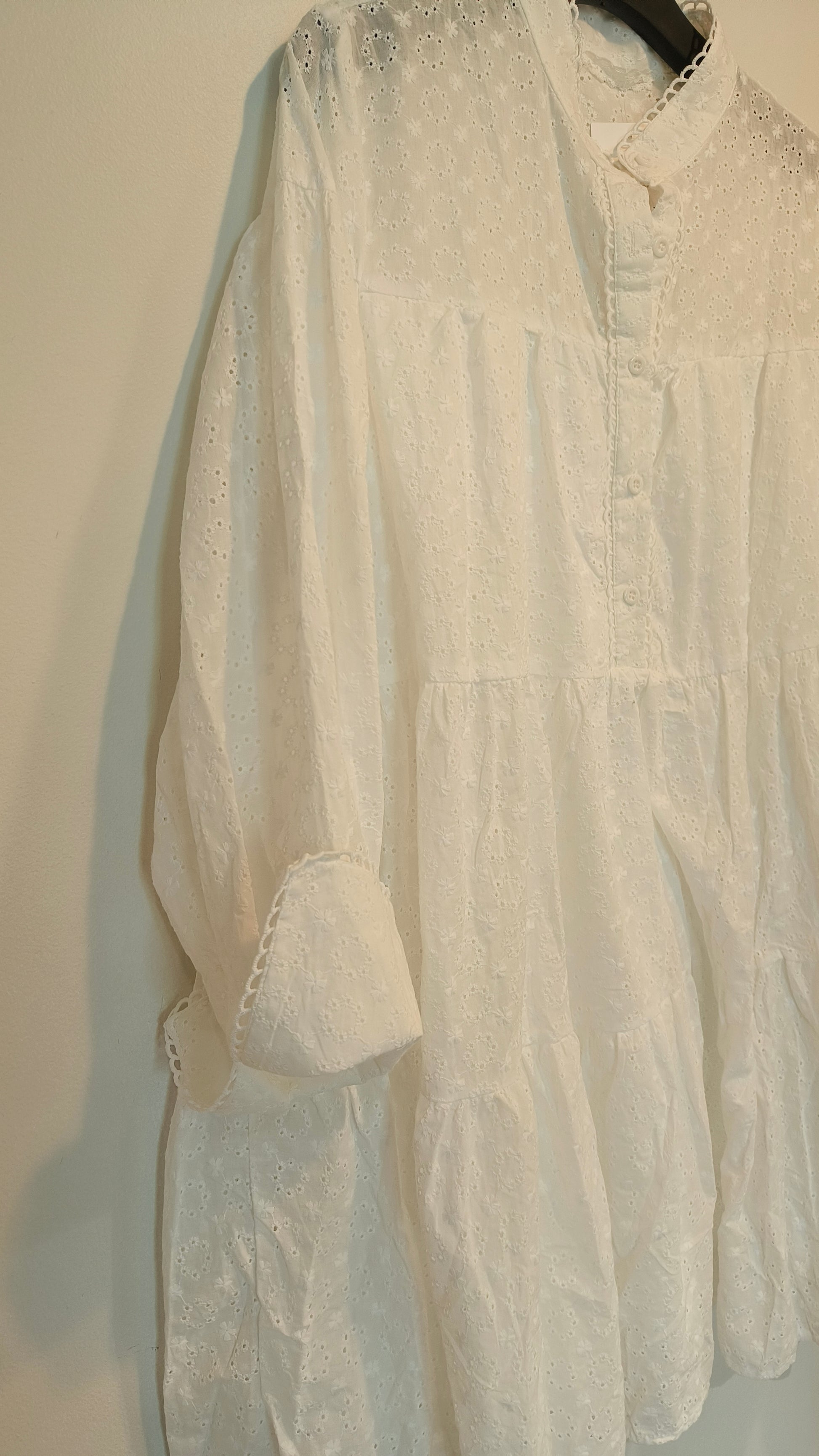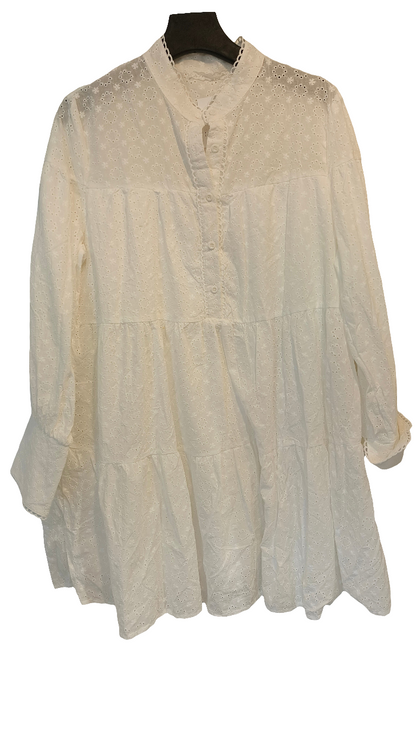 Tunika/klänning i broderat anglais-tyg, med knappar under bysten, långa ärmar, fast underkjol, avslappnad passform.