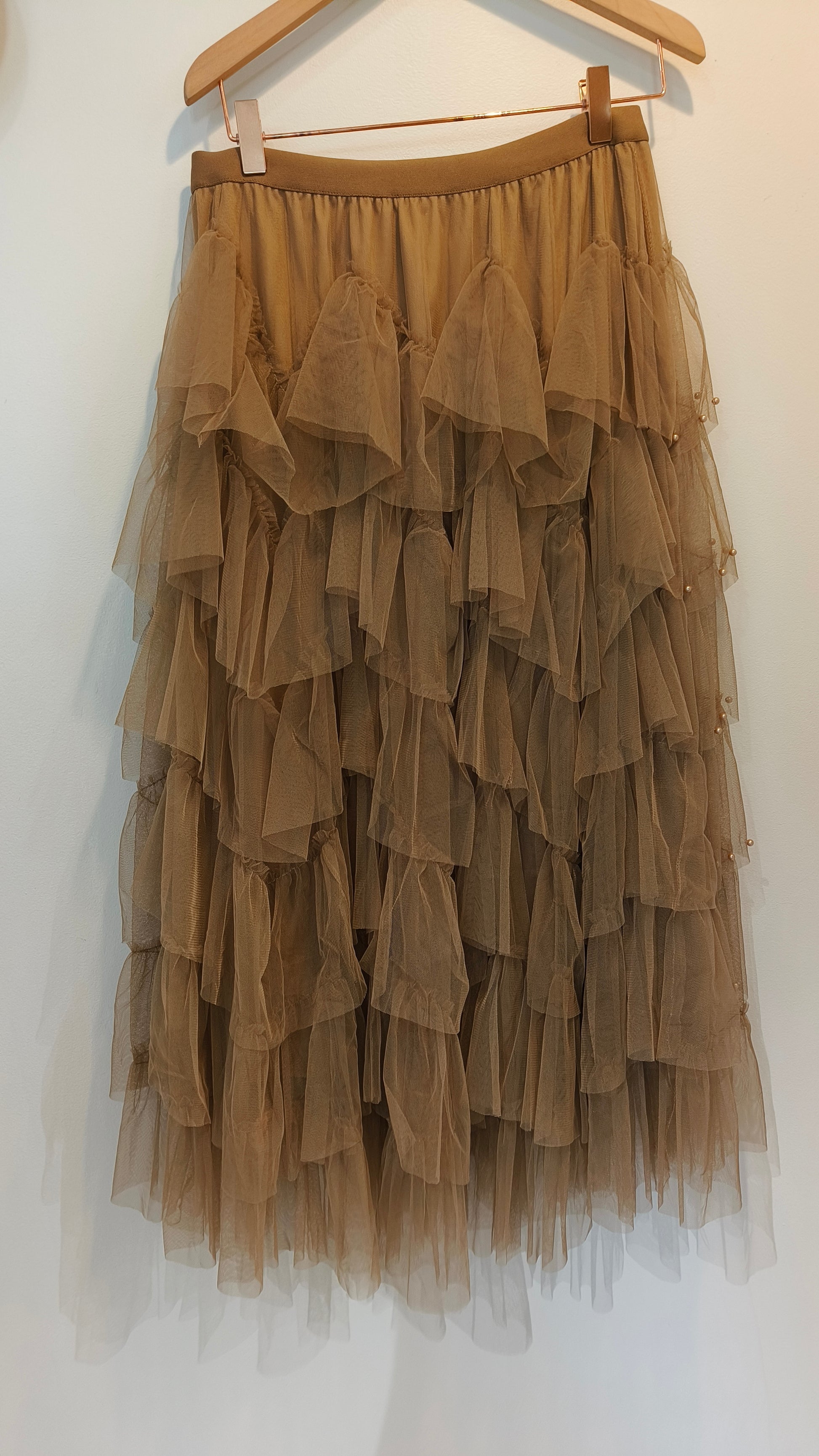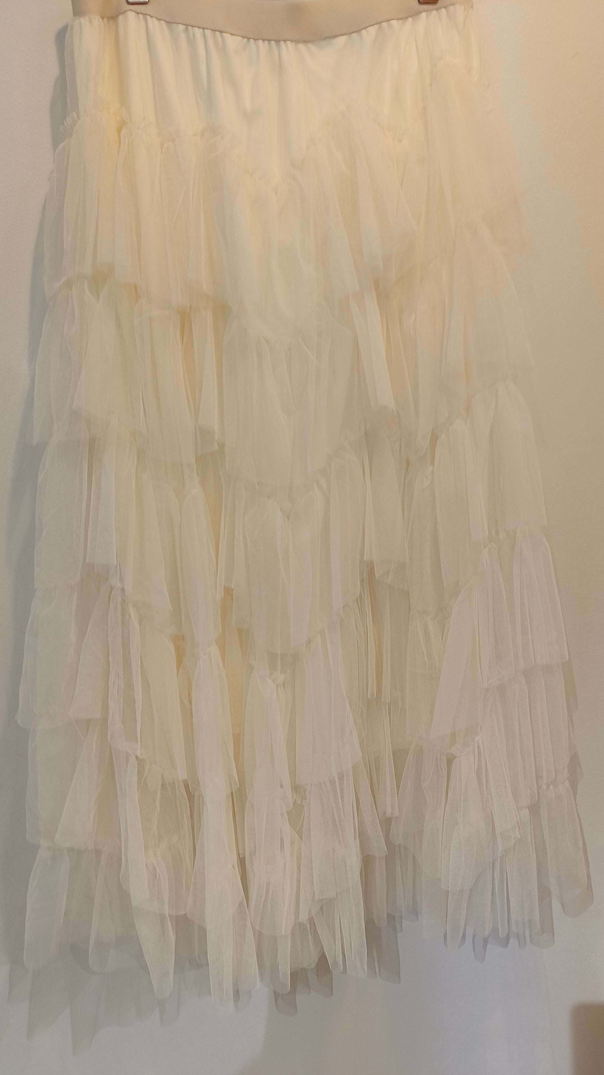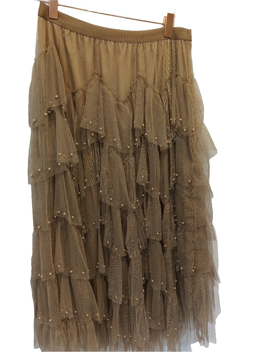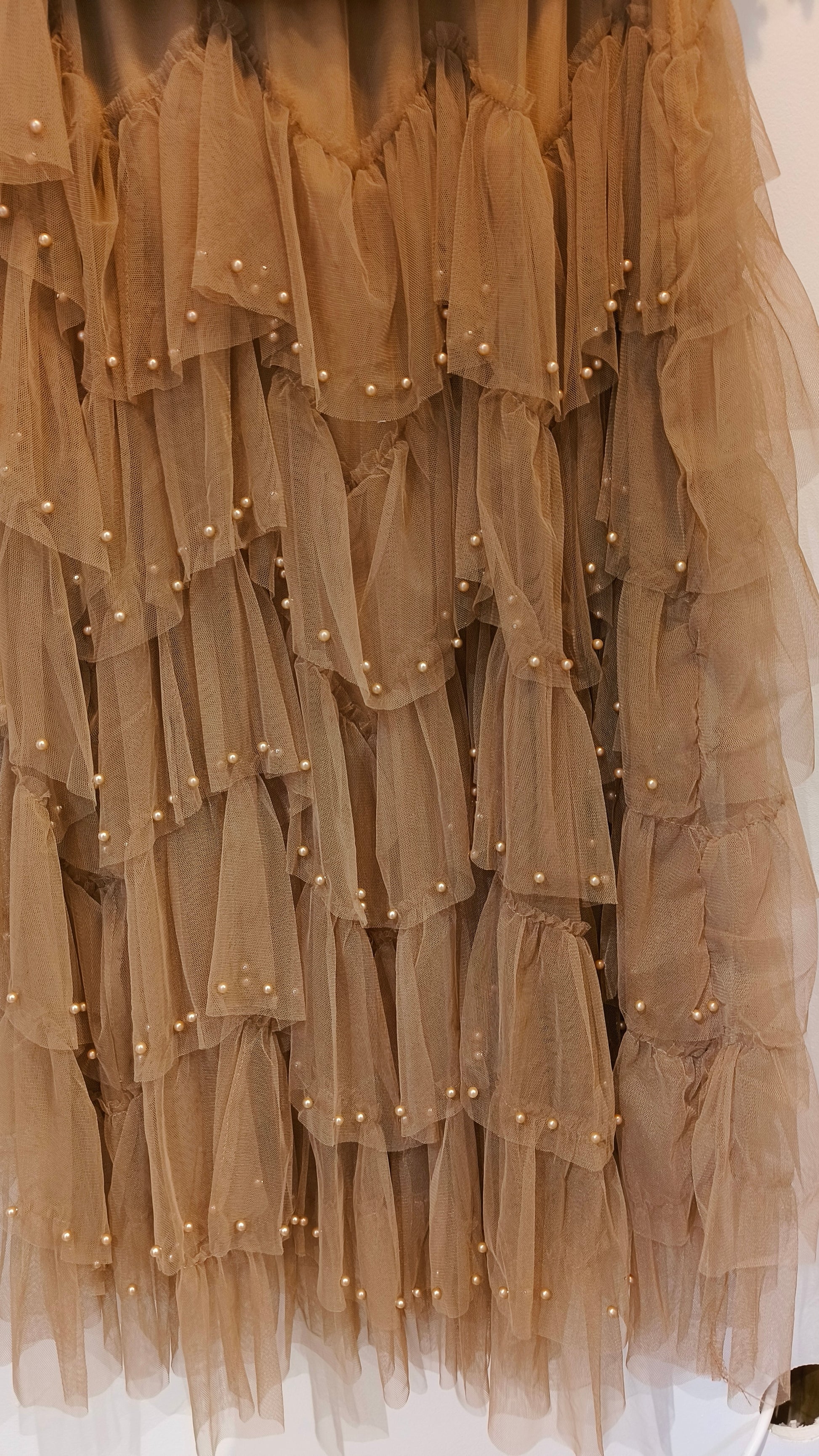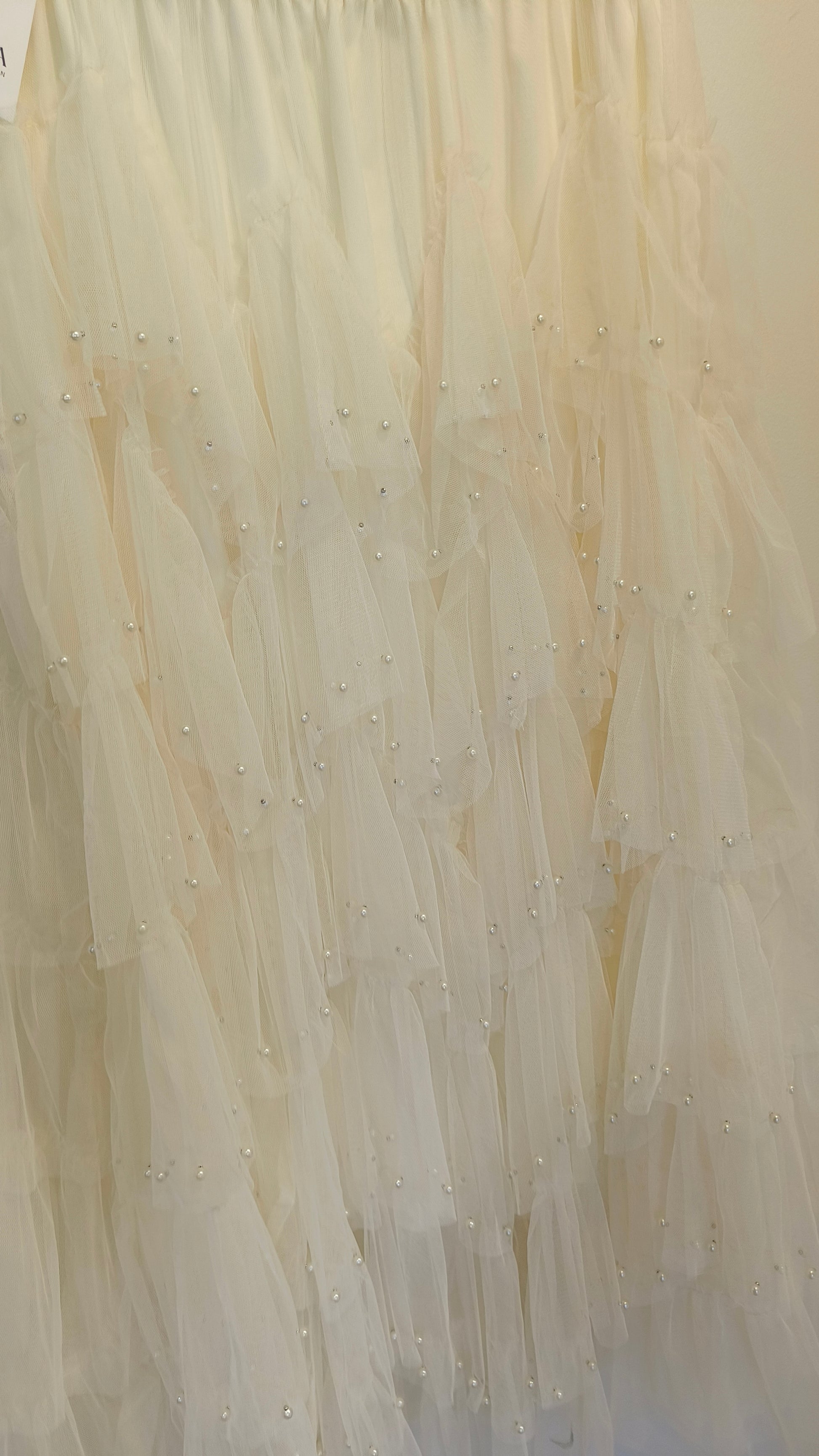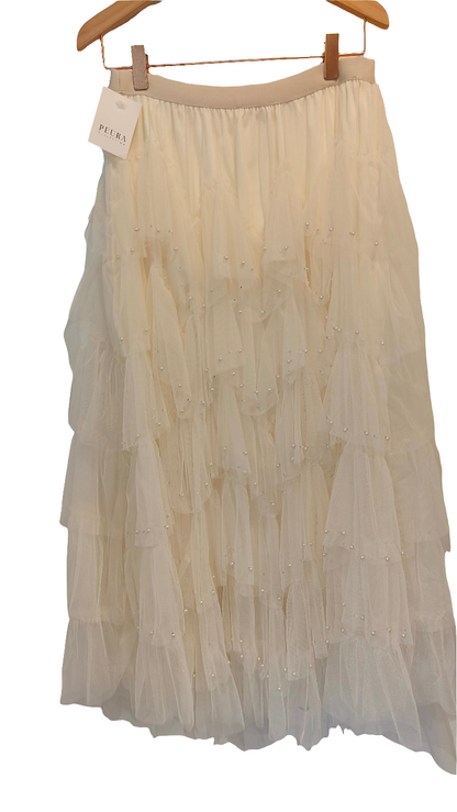 Vacker tyllkjol med pärlbroderi framtill, resår i midjan och avslappnad passform. Matcha med en Helmi-tröja . One size.