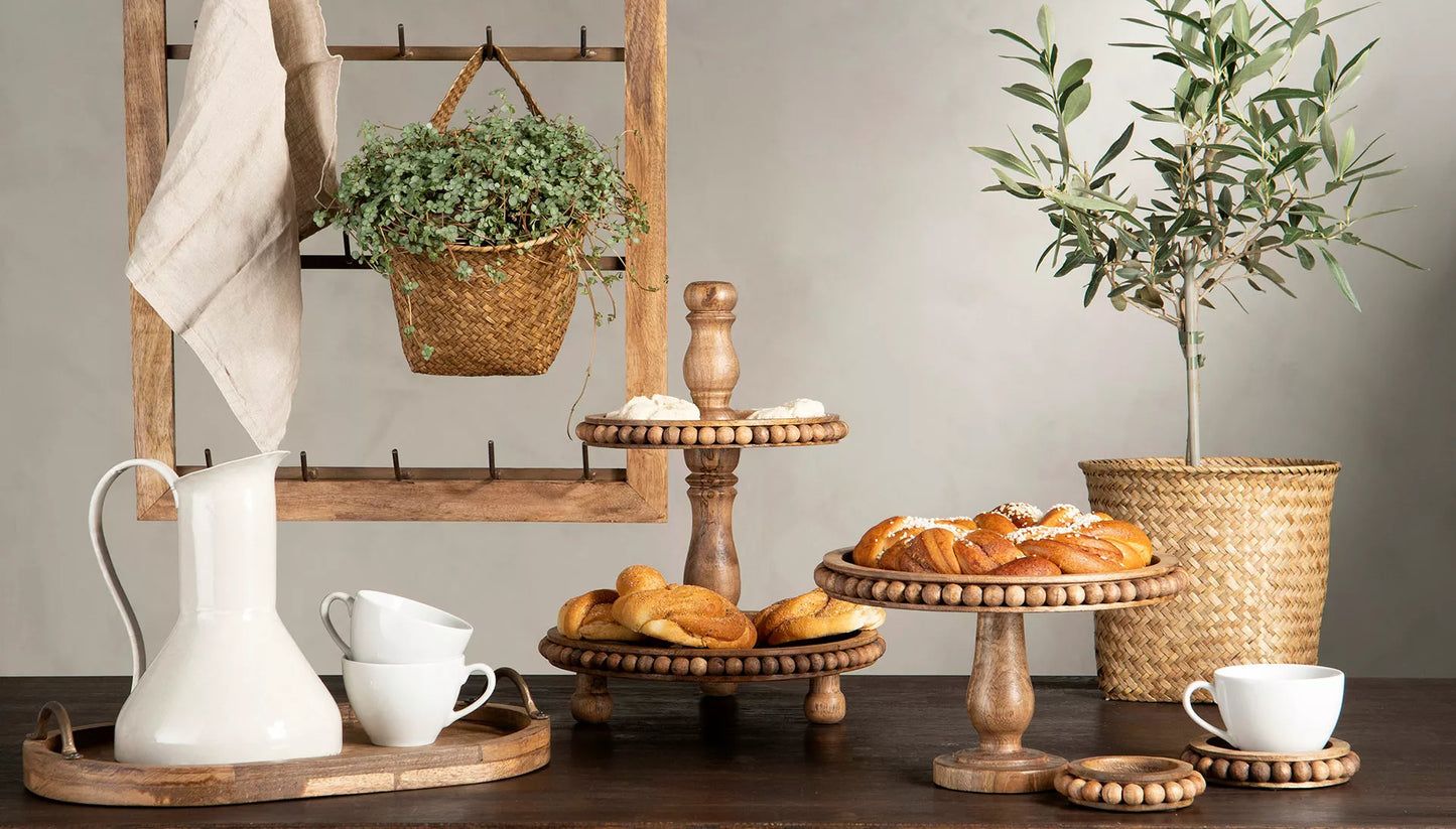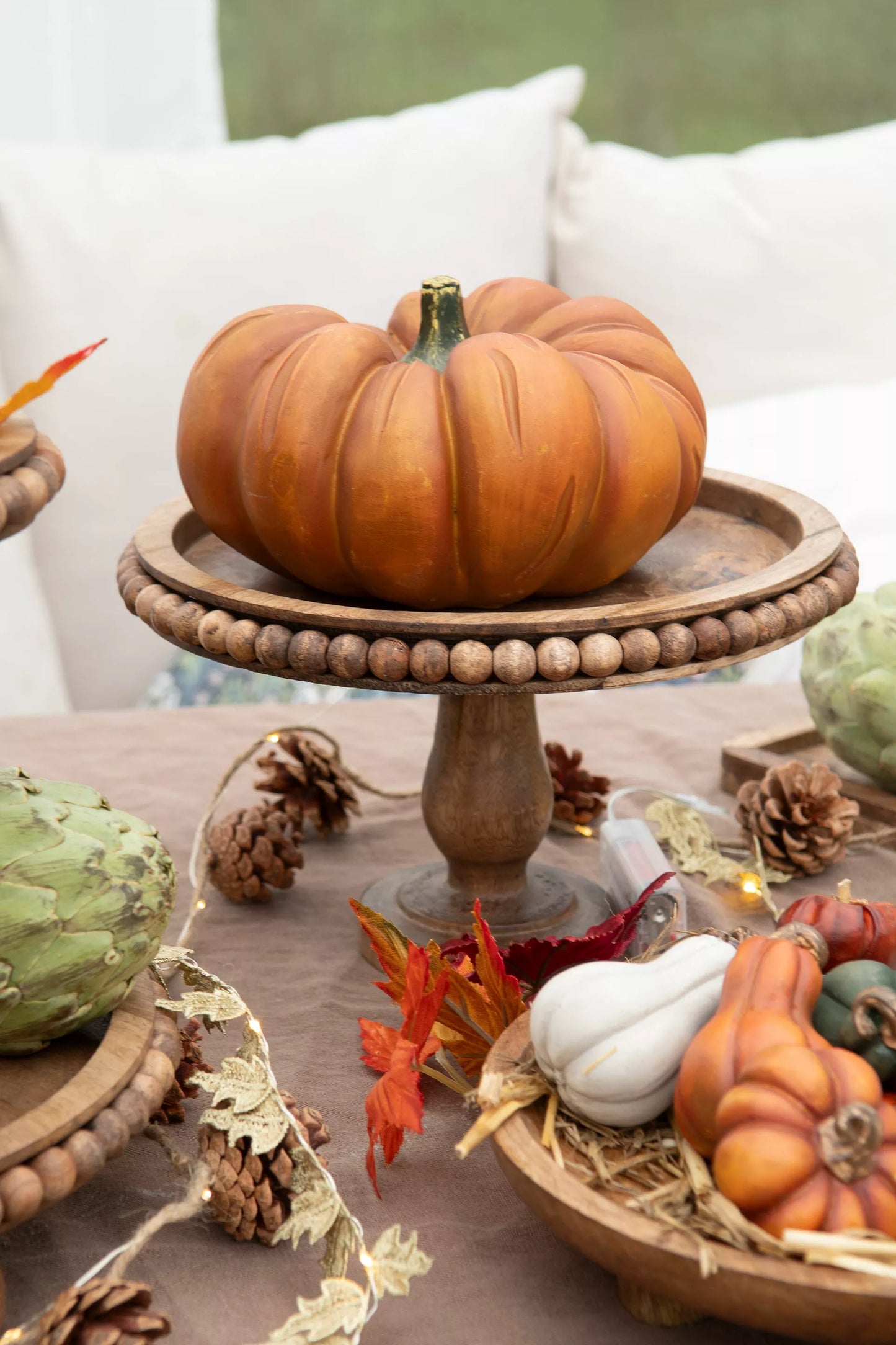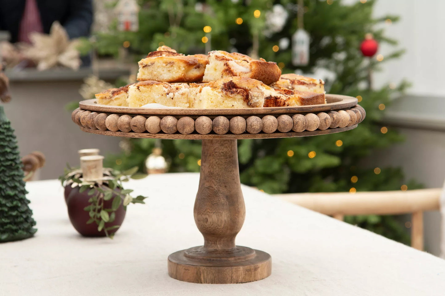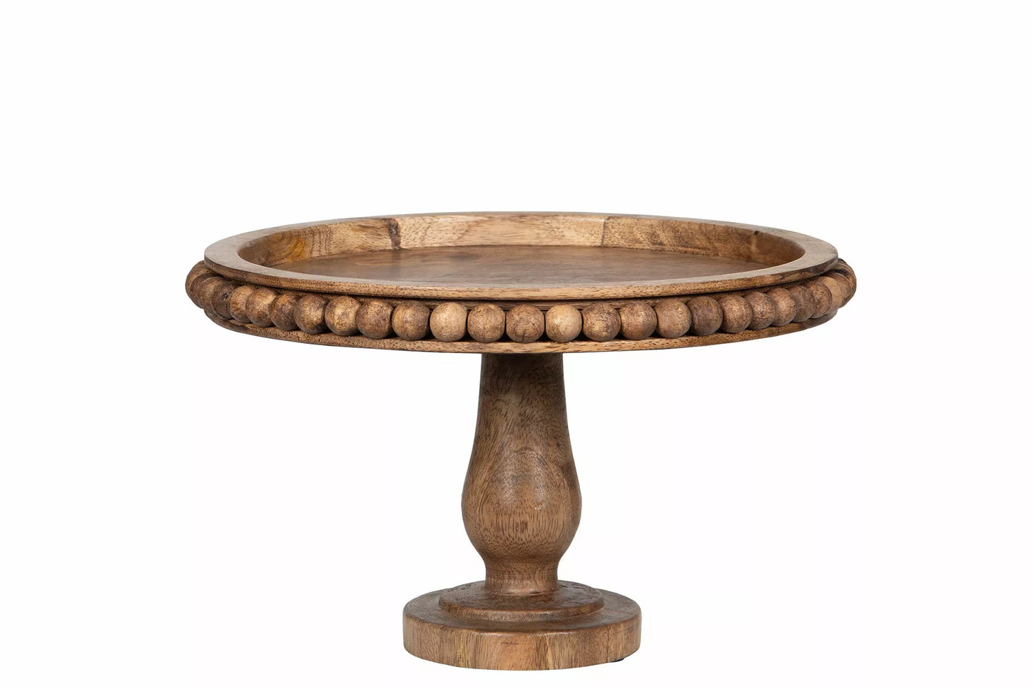 Ett serveringsfat med fot, med en vacker träpärldekoration på kanten. Minsta brickan från samma serie.